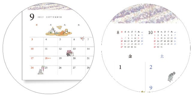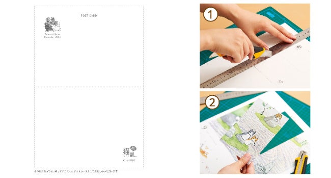 終わった月のカレンダーは、ポストカードとして再利用できる仕様になっています。裏面のガイドラインに沿ってカットすれば、簡単にポストカードが完成します。少し厚手の紙を使用しているので、カレンダーとして楽しんだあとも、お手紙やディスプレイに活用できます。