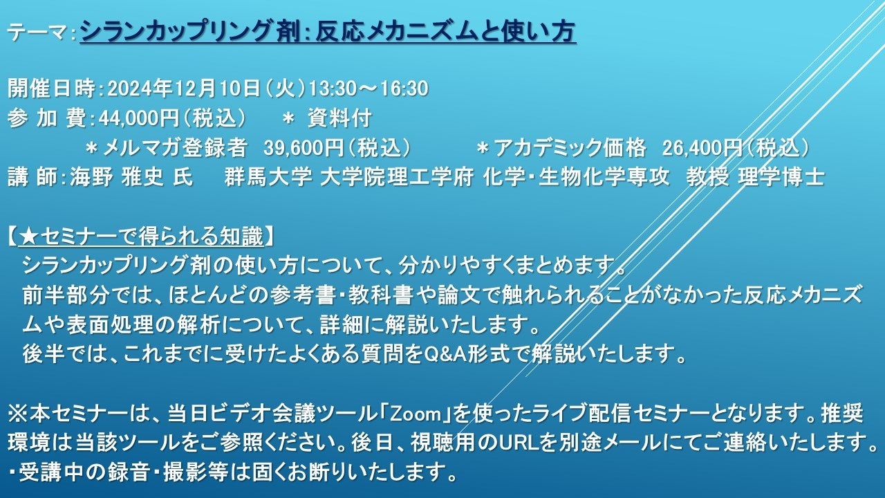 【ライブ配信セミナー】シランカップリング剤:反応メカニズムと使い方 12月10日(火)開催 主催:(株)シーエムシー・リサーチ