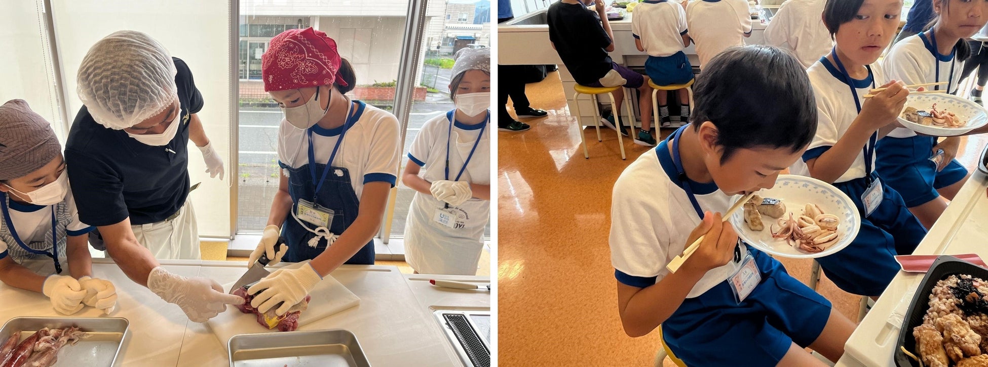 まずは、実際にシイラをさばく調理体験をしました。初めての体験にみんな大苦戦。先生方のサポートを受けながら、なんとかみんなでさばくことができました。自分でさばいたからこその達成感はひとしおです。焼きあげたシイラのソテーを食べた隊員からは「やわらかくて食べやすい」「おいしい!」といった声があがっていました。