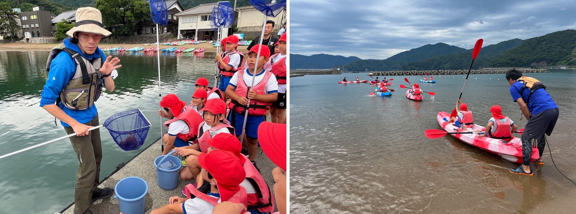 2日目のスタートは阿納海水浴場で、生き物観察のスペシャリストの渡辺 幸太さんから、若狭湾の生き物について教えてもらいました。若狭湾にはどんな生き物が住んでいる?堤防から網で生き物をすくって観察します。多種多様な海の生き物に目を輝かせる隊員たち。中には大きなウニも!たくさんの生き物が住んでいることを実感するとともに、地球温暖化などの環境変化が主な原因となり、増えすぎたウニによって藻場が食い荒らされる「磯焼け問題」に直面していることも知りました。フィールドワークの後はシーカヤックで海に漕ぎ出します。若狭湾の豊かさを実感しました。
