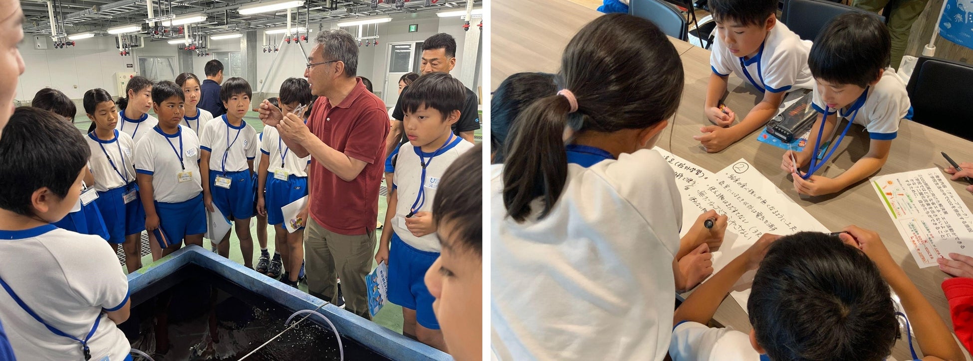 お昼にシイラの焼き物やフライをお腹いっぱいに食べ、福井県立大学かつみキャンパスに会場を移して午後の部がスタート。福井県立大学海洋生物資源学部の富永教授より、シイラの生態や、海の環境の変化について教えていただきました。近年の気候変動に伴う海面水温の上昇や海面水位の上昇を、グラフを交えて学習。海洋生態系に取り込まれた炭素を「ブルーカーボン」と呼び、地球温暖化対策としての吸収源として注目されていることも学びました。これまでの学びで、地球温暖化が私たちの小浜の海に影響を与えていることがわかった隊員たち。「小浜の海を守るために自分たちができることは何だろう?」学校生活の中で排出されるCO2と、その削減に向けた解決策をグループに分かれて話し合い、発表し1日目を締めくくりました。