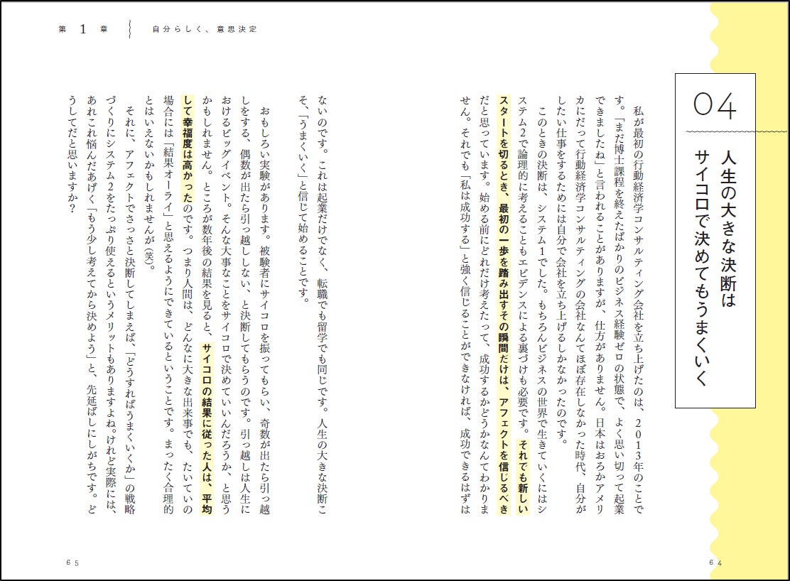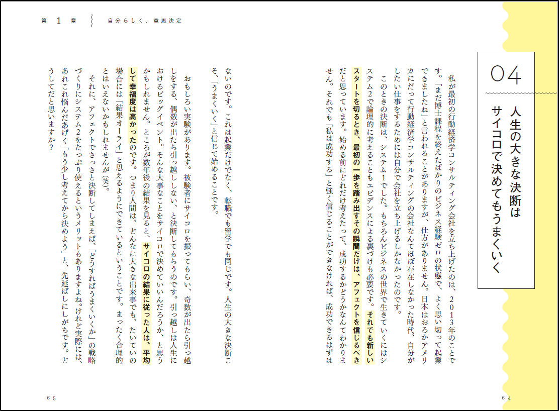 極端なことを言えば、サイコロで決めてしまってもいい、と。これは、感情論ではなく、実験によって証明されたことでもあります。大きな決断をするときには、「うまくいく」と信じてまずは一歩を踏み出してみること、それでも決断に悩む人は、いっそサイコロに決断を委ねてみてはいかがでしょうか?