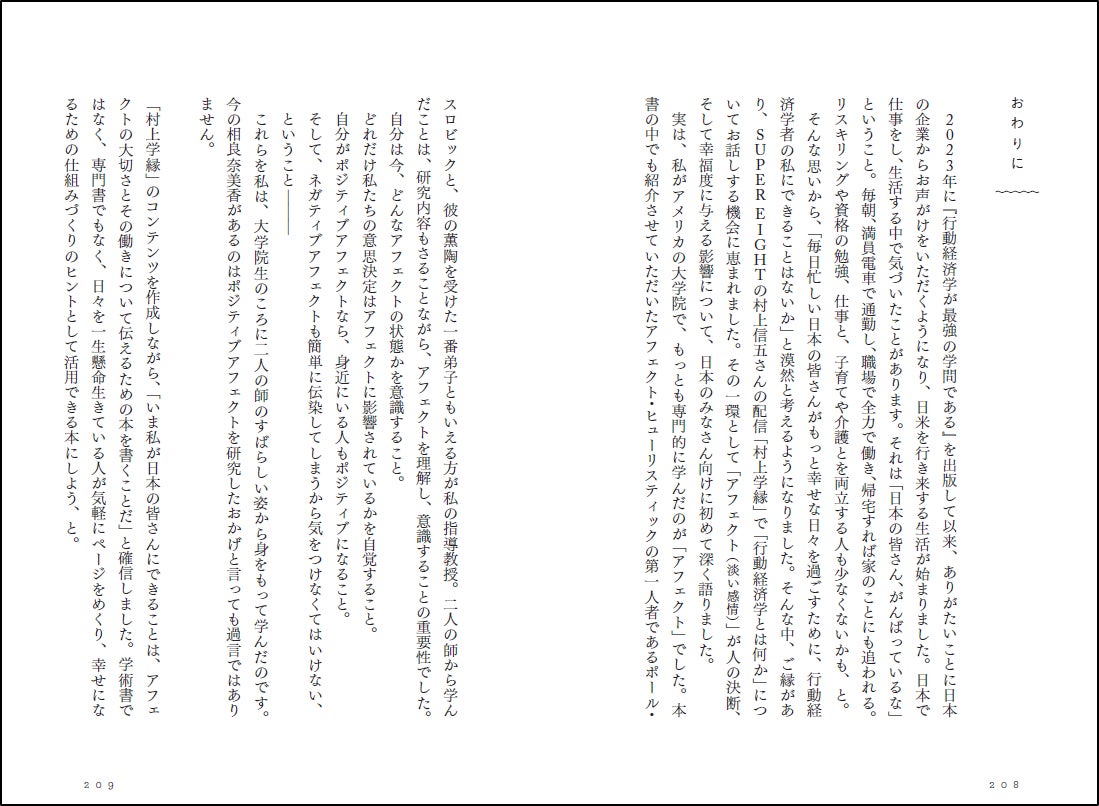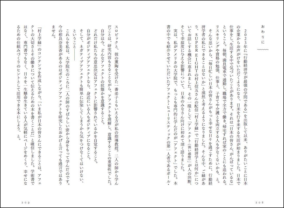 ほかにも、ここだけでは伝えきれない「アフェクト」の重要性とその活用方法。様々な悩み、場面において行動経済学の知識を利用して、読者のみなさんの生活を少しでも上向きにするお手伝いをさせていただきます。ぜひ、一度お手に取ってみてください!