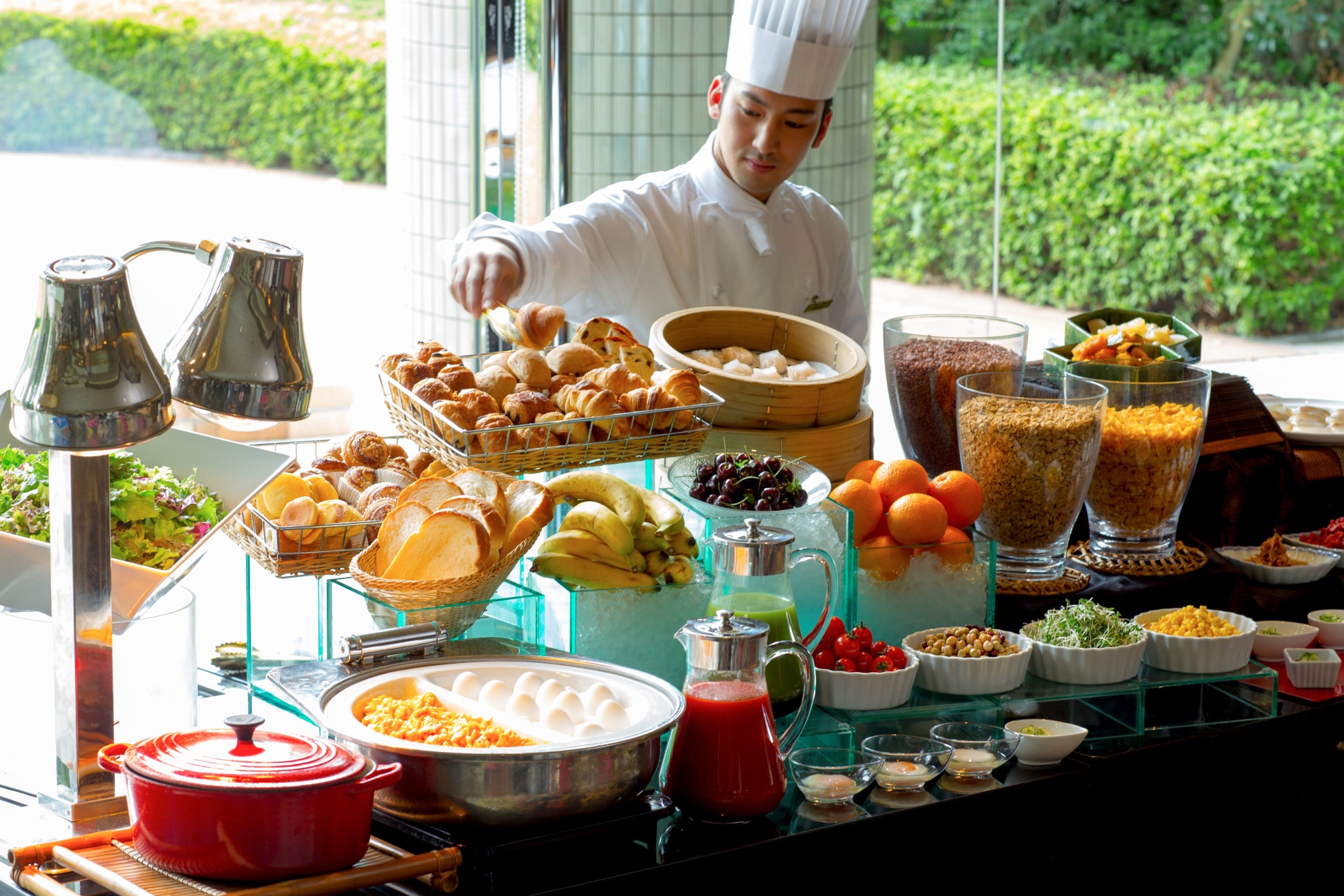 さらに翌日にはオールデイダイニング「SATSUKI」にて、③“美味と健康”がテーマの朝食ビュッフェをご用意。「健康的なおいしい朝食を愉しんでいただきたい」というシェフの思いから誕生した当ビュッフェでは、栄養価が高い「玄米卵」を使用したふわとろのオムレツをはじめとする、和・洋・中幅広いメニューをラインアップしました。