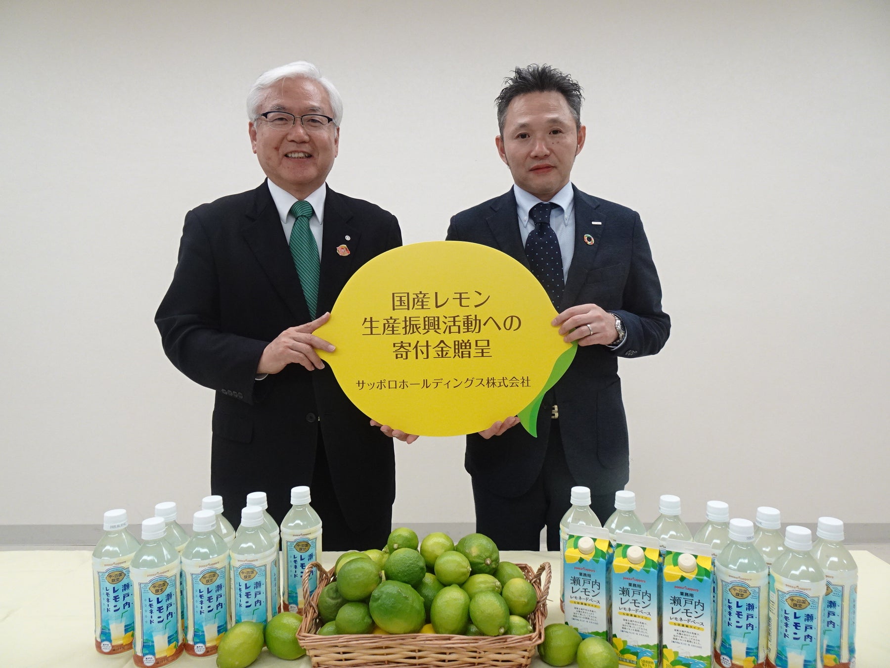 サッポロホールディングス(株)は、2023年度の株主優待制度を通じた株主様からの寄付金121万4,000円に同額を加えた242万8,000円を、広島県豊田郡大崎上島町の「国産レモン生産振興活動」へ寄付しました。