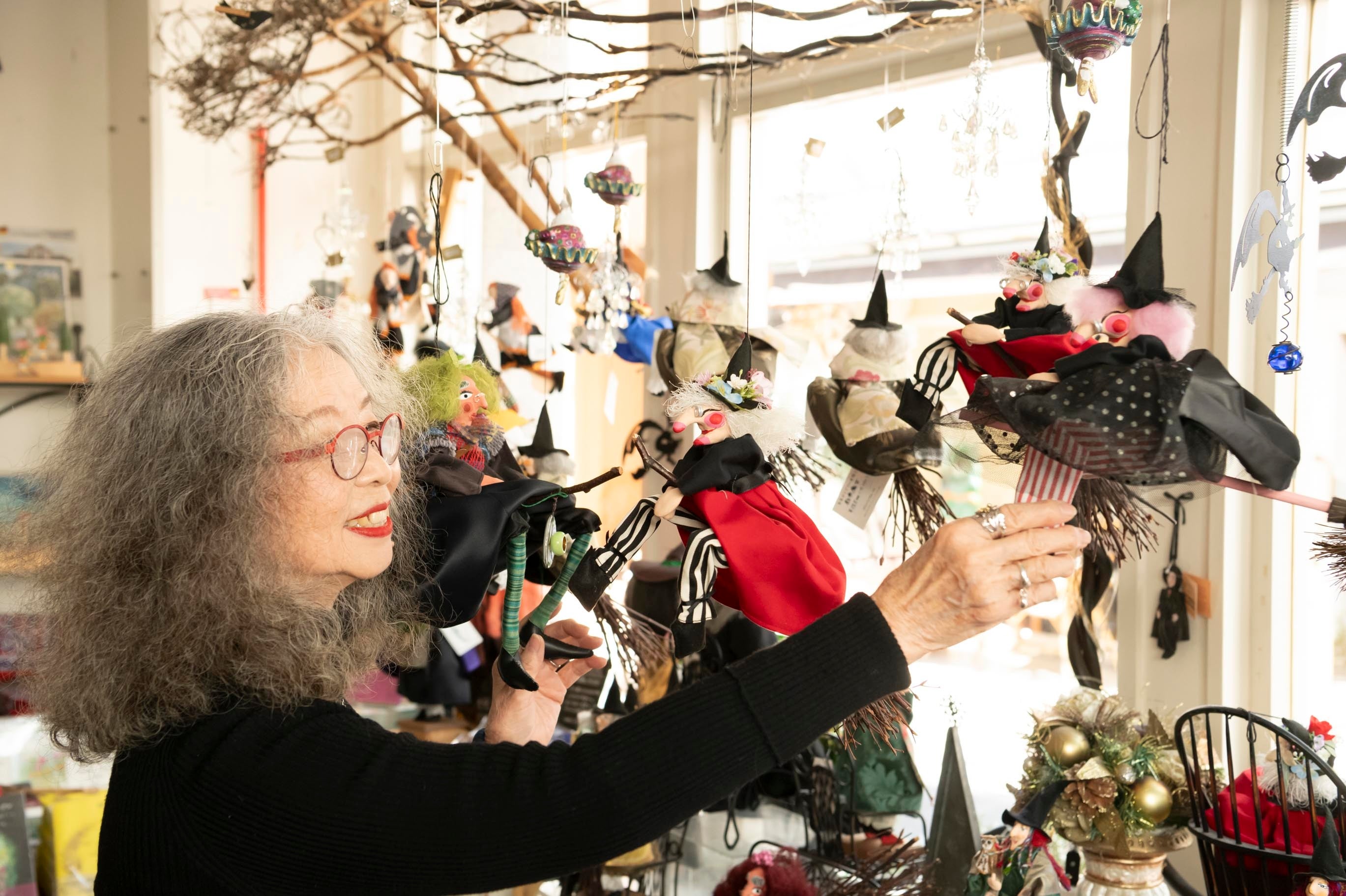 飯島氏は、40年にわたり、横浜元町で「魔女とハーブの店」を営む魔女人形デザイナーでもあります。80歳をすぎても店舗にたち、新しいデザインの魔女人形を作り続けています。