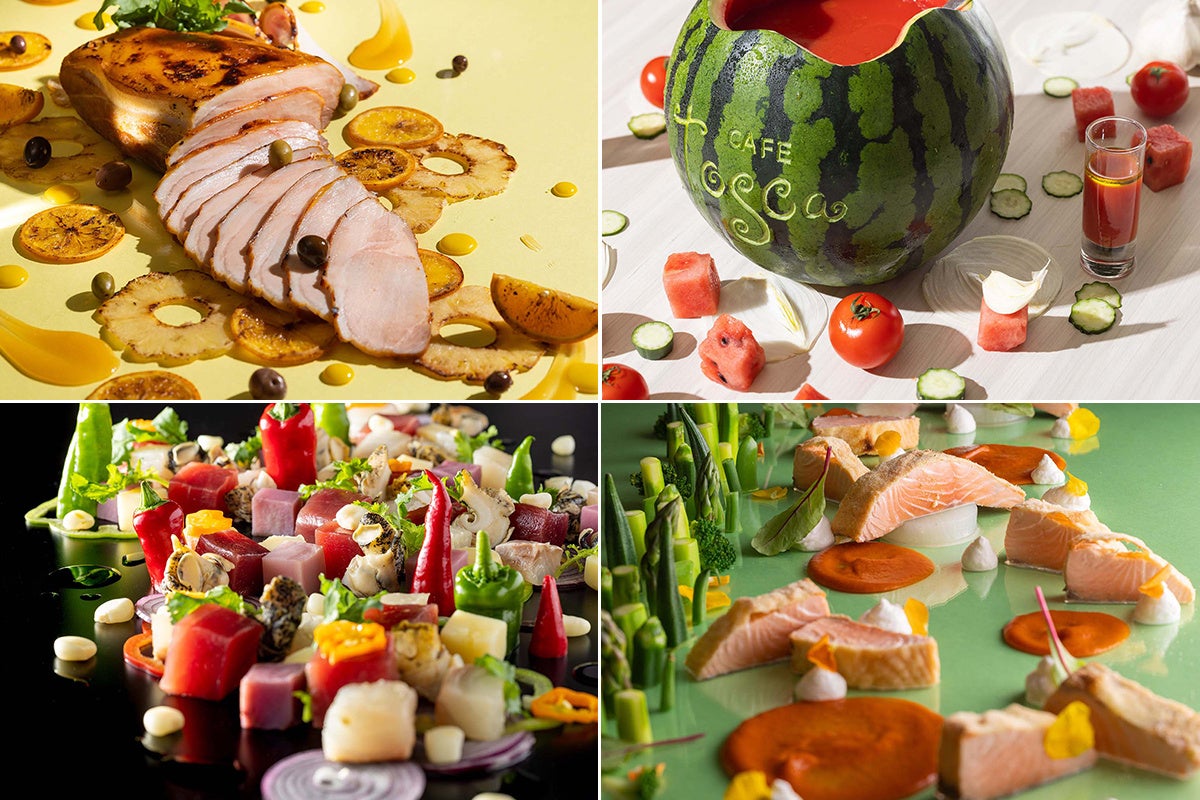ニュージーランド、ペルー、メキシコ、ベトナムなど、環太平洋地域(パシフィック・リム)のバラエティー豊かな味わいを取り揃えたブッフェを開催いたします。オレンジとパイナップルで仕上げた甘めのソースで、お子さまでも食べやすい「ローストポーク」(写真①・ディナー限定)や、さっぱり美味しい冷製スープ「スイカとトマトのガスパチョ」(写真②)をはじめ、ピリ辛ソースでお召し上がりいただく「サーモンのロースト」(写真③)、ペルー名物のシーフードマリネ「セビーチェ」(写真④・ディナー限定)などが登場いたします。