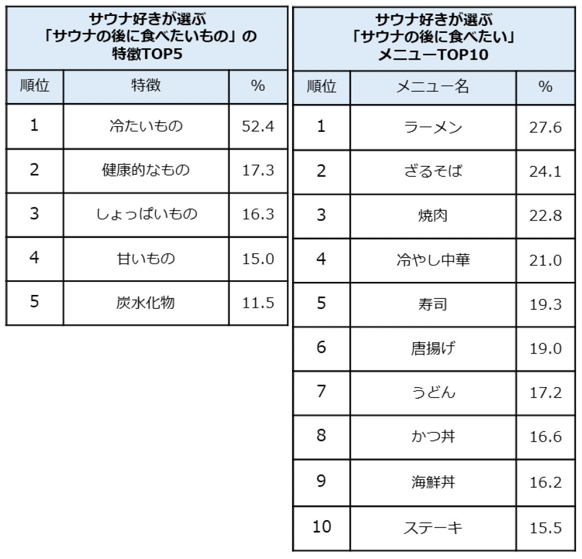 ※「サウナの後に食べたいメニュー」で提示した選択肢:カレーライス、インドカレー、カツカレー、寿司、刺身、味噌汁、かつ丼、天丼、親子丼、牛丼、海鮮丼、卵かけご飯、ご飯、おにぎり、和定食、唐揚げ、ポテトフライ、とんかつ、しゃぶしゃぶ、生姜焼き、エビフライ、ラーメン、餃子、シュウマイ、麻婆豆腐、酢豚、スパゲッティ、ピザ、ハンバーガー、ホットドック、BLTサンド、オムライス、焼肉、牛タン、ステーキ、ハンバーグ、焼き鳥、鍋類(もつ鍋、ちゃんこ鍋など)、うどん、カレーうどん、温かいそば、ざるそば、冷やし中華、サラダチキン、サラダ、その他(自由回答)