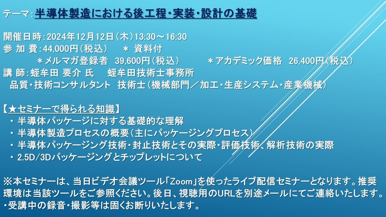 先端技術情報や市場情報を提供している(株)シーエムシー・リサーチ(千代田区神田錦町: https://cmcre.com/ )では、 各種材料・化学品などの市場動向・技術動向のセミナーや書籍発行を行っておりますが、 このたび「半導体製造における後工程・実装・設計の基礎」と題するセミナーを、 講師に蛭牟田 要介 氏 (蛭牟田技術士事務所 品質・技術コンサルタント 技術士(機械部門/加工・生産システム・産業機械))をお迎えし、2024年12月12日(木)13:30より、 ZOOMを利用したライブ配信で開催いたします。 受講料は、 一般:44,000円(税込)、 弊社メルマガ会員:39,600円(税込)、 アカデミック価格は26,400円(税込)となっております(資料付)。