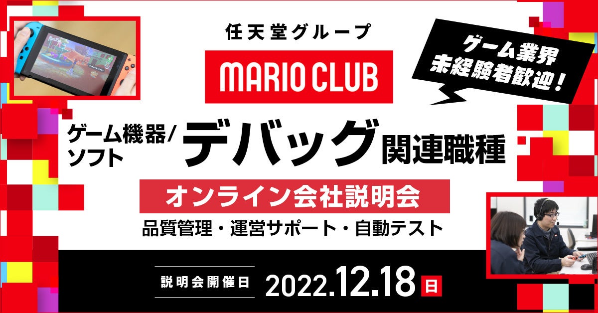 マリオクラブは、任天堂の100%出資会社です。任天堂のゲーム開発に精通した人材がチームとなり、任天堂開発部門のパートナーとしてデバッグ、モニターサービス、スマートデバイス関連といった事業を展開しています。今回、同社では初となるキャリア採用のオンライン説明会を開催することとなりました。