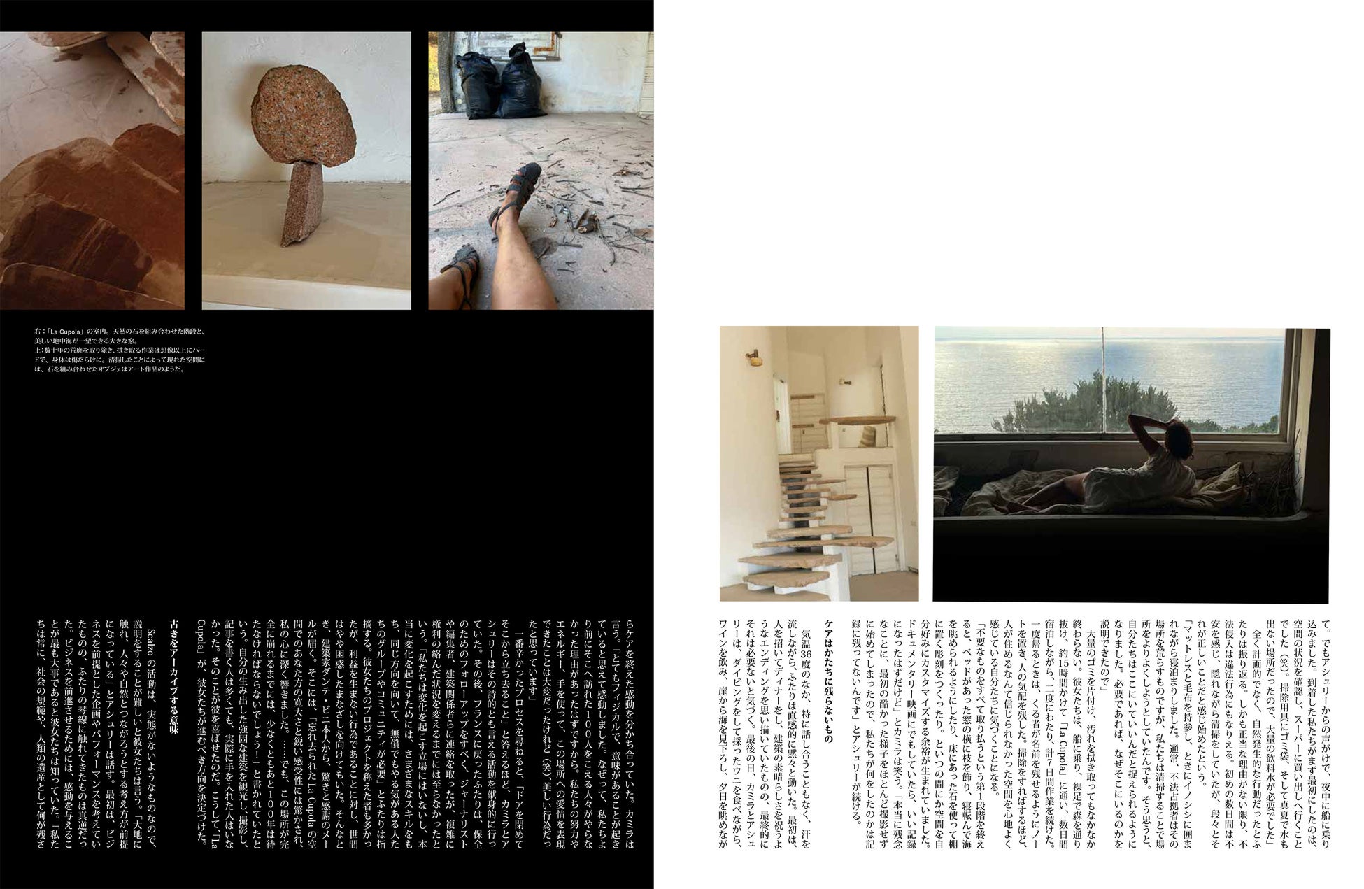 編集室のメンバーと議論するなかで、本号のテーマとして「care」を選んだのは自然な流れでした。 私の母国フランスには「サヴォア・ヴィーヴル(savoir-vivre)」という言葉があります。これは礼儀や思いやりを表すのですが、日本での滞在で、「care」の精神を一層強く感じ、それをさまざまにかたちで表現することに取り組みました。