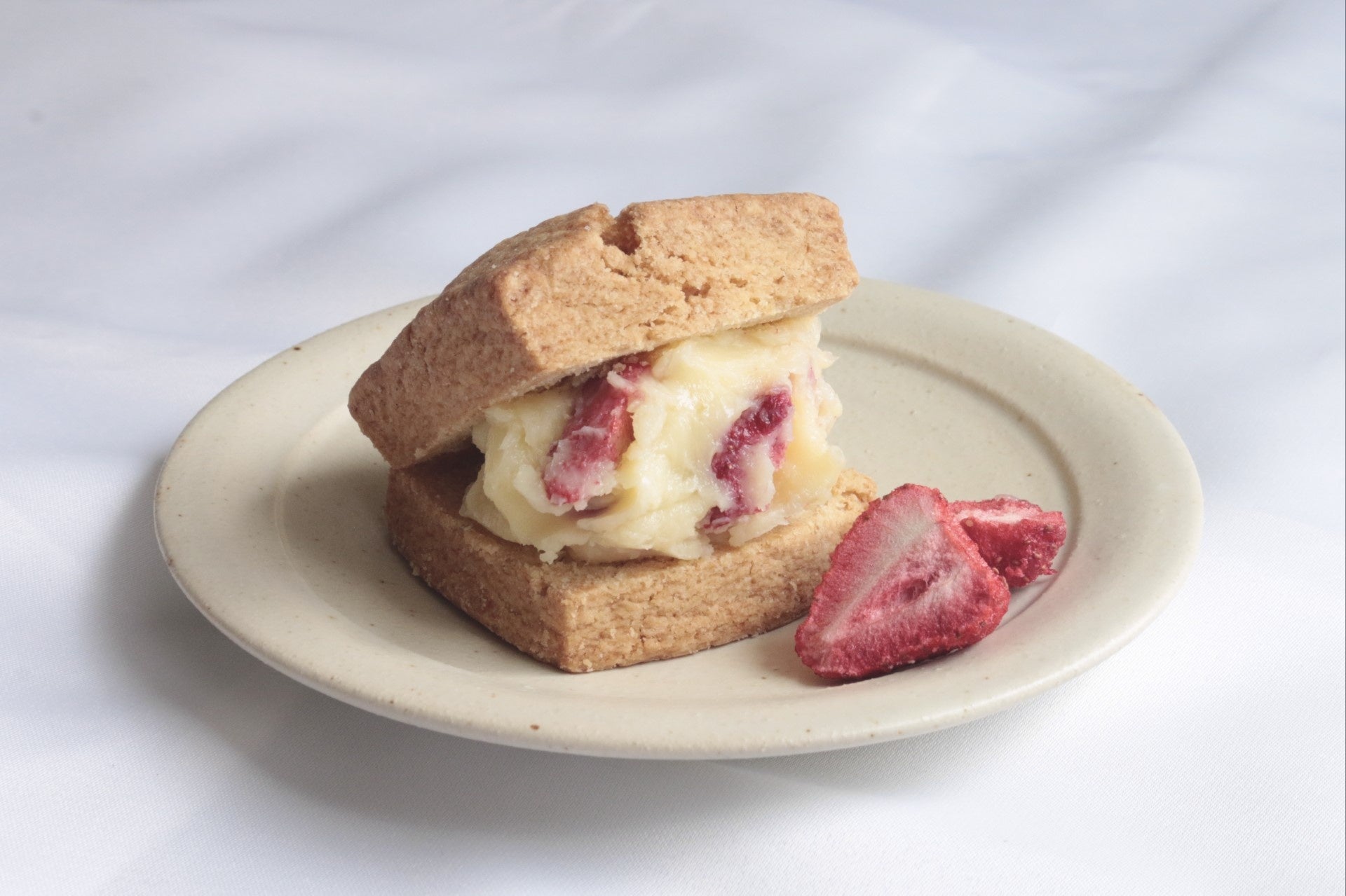 愛知県のスコーンと焼き菓子の工房< Lycka (リッカ)>は通常はオンラインのみでの販売を行っており今回初登場です。バタークリームにはフランス中西部・エシレ村で伝統を守り作られ、芳酵な香りが特徴のフランス産発酵バター(エシレバター)を使用し、とてもクリーミーな口あたりです。濃厚な味わいですが、ほどよい甘さと軽い食感、そして苺の酸味がアクセントになる味わいのスコーンサンドです。