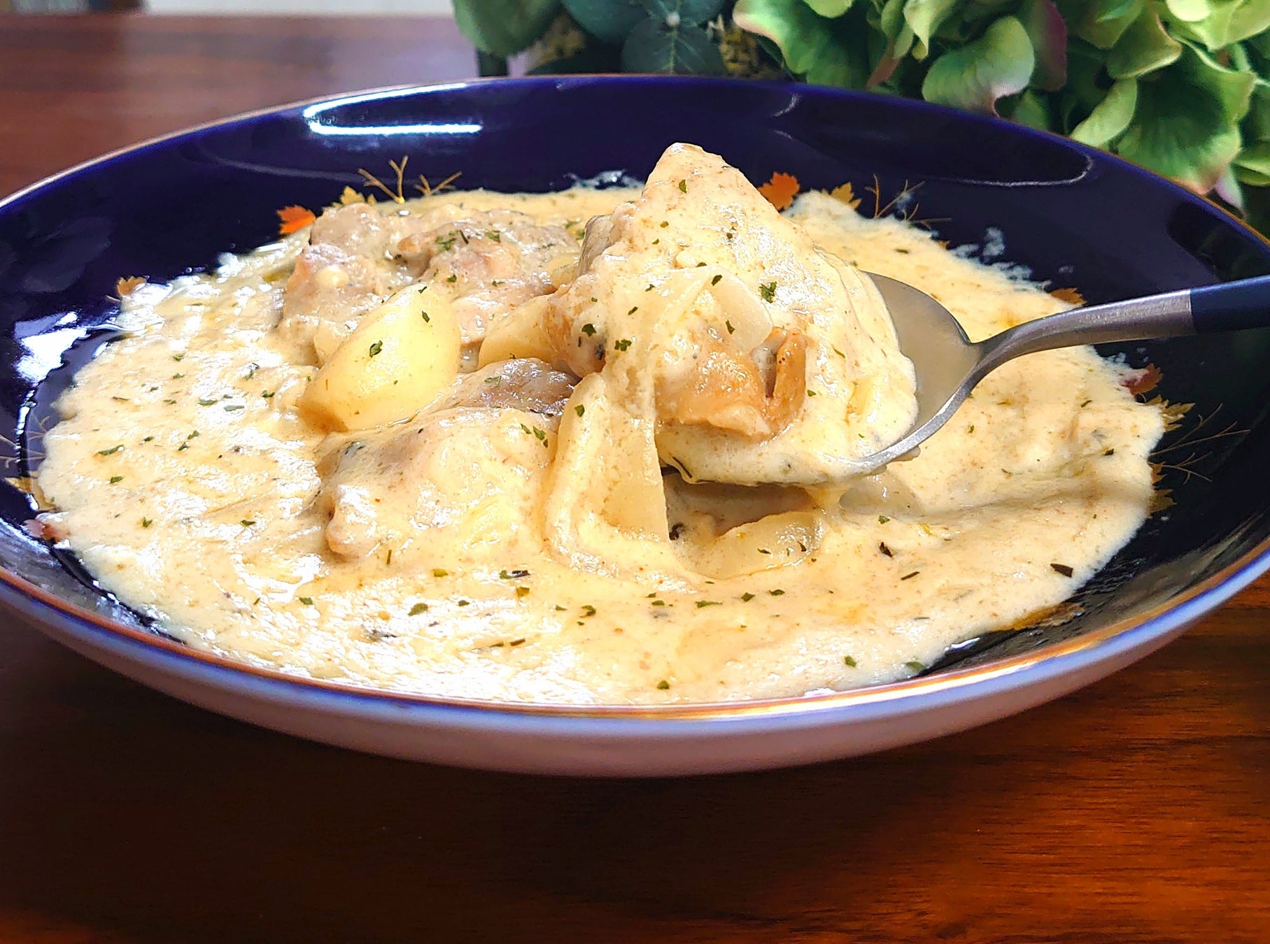 ロシア料理レストラン<ロゴスキー>からはジョージアの伝統料理「シュクメルリ」が登場。 クリームとにんにくたっぷり鶏肉のチーズクリーム煮込みです。鶏肉は国産鶏肉を使用し、クリームソースにこだわりをもって厳選した各種スパイスやハーブとチーズを加えた濃厚な味が特徴的です。