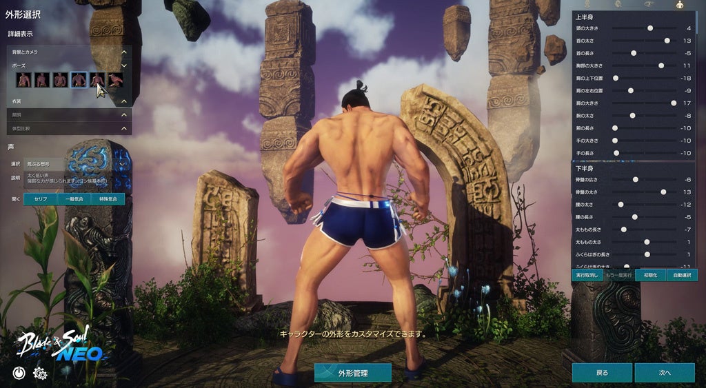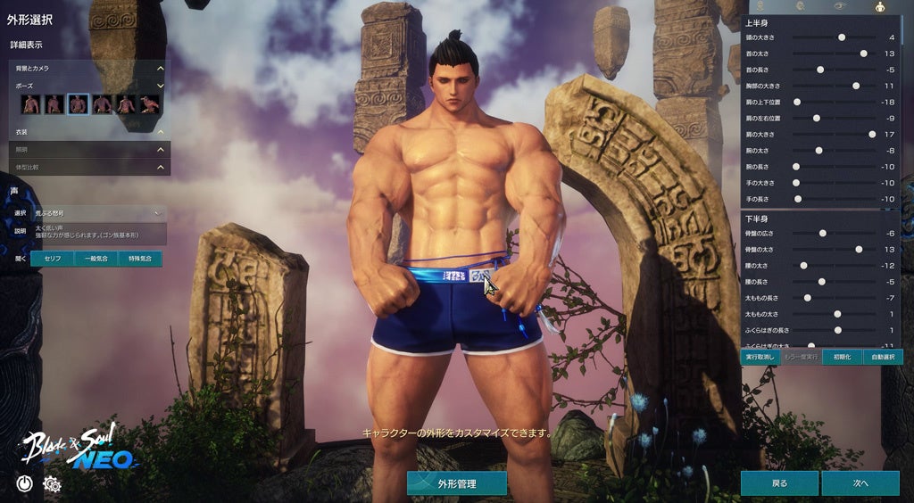 元々「ブレイドアンドソウル」では、9999兆通りのキャラクタークリエイトが可能でしたが、「ブレソネオ」では、ヘアスタイルや選べるパーツが増えたほか、スライドバーで調節できる幅が広がるなど、さらに選択の幅が増えており、今回及川氏が理想とするからだ作りをゲーム内で再現するには、うってつけのリメイクとなりました。