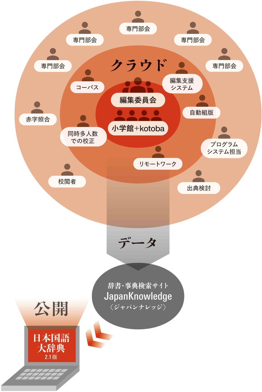 第三版でも同じく数多くの専門家の協力を得て、基礎語、漢籍、方言、中世、近世、近現代、アクセントなど、さまざまな分野の編集部会を設置。日本中の研究者をつなぎ、各分野の情報を刷新します。また、クラウド上でのデータ共有や、編集支援システムの活用、自動組版の仕組みの構築など、新しい技術によって辞書の作り方を大きく変えます。そうして得られた成果は、インターネット(JapanKnowledge)を通じて段階的に公開していく予定です。