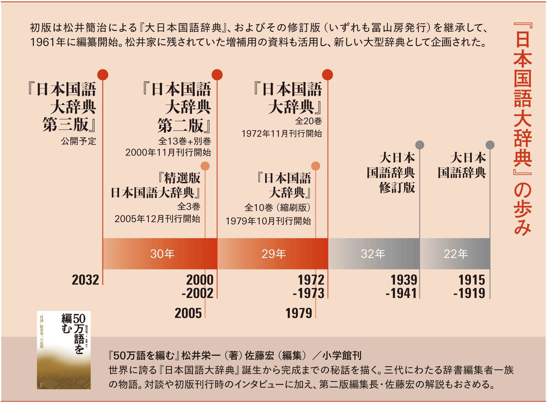 長きにわたって文化は言葉で記され、国語辞典はそれを読み解く鍵でした。明治・大正時代に、古典世界を見通せる堅牢で信頼できる鍵を求めて松井簡治が日本初の大型国語辞典『大日本国語辞典』を編み、小学館は、戦後、孫の松井栄一とともに新しい日本語を考えるよすがとして『日本国語大辞典』『同 第二版』を作り上げました。
