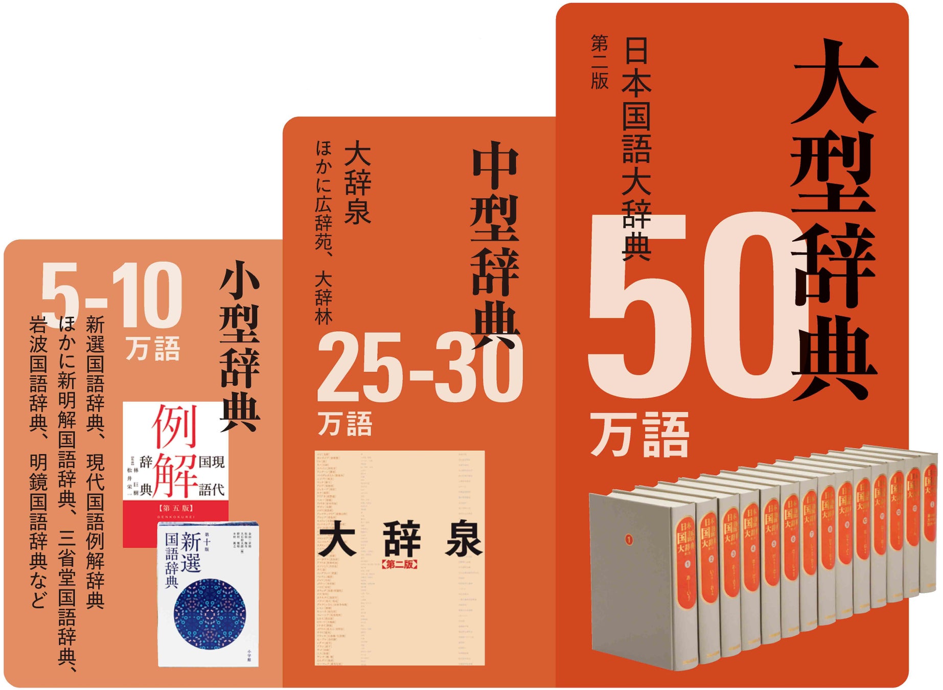 『日本国語大辞典 第二版』は日本最大にして唯一の大型国語辞典です。よく使われる『新選国語辞典』『現代国語例解辞典』など小型辞典の収録語数は5~10万語、『大辞泉』などの中型辞典はおおむね25~30万語が収録されており、一方で本辞書の収録語数は50万を誇ります。※販売中のものに限る。