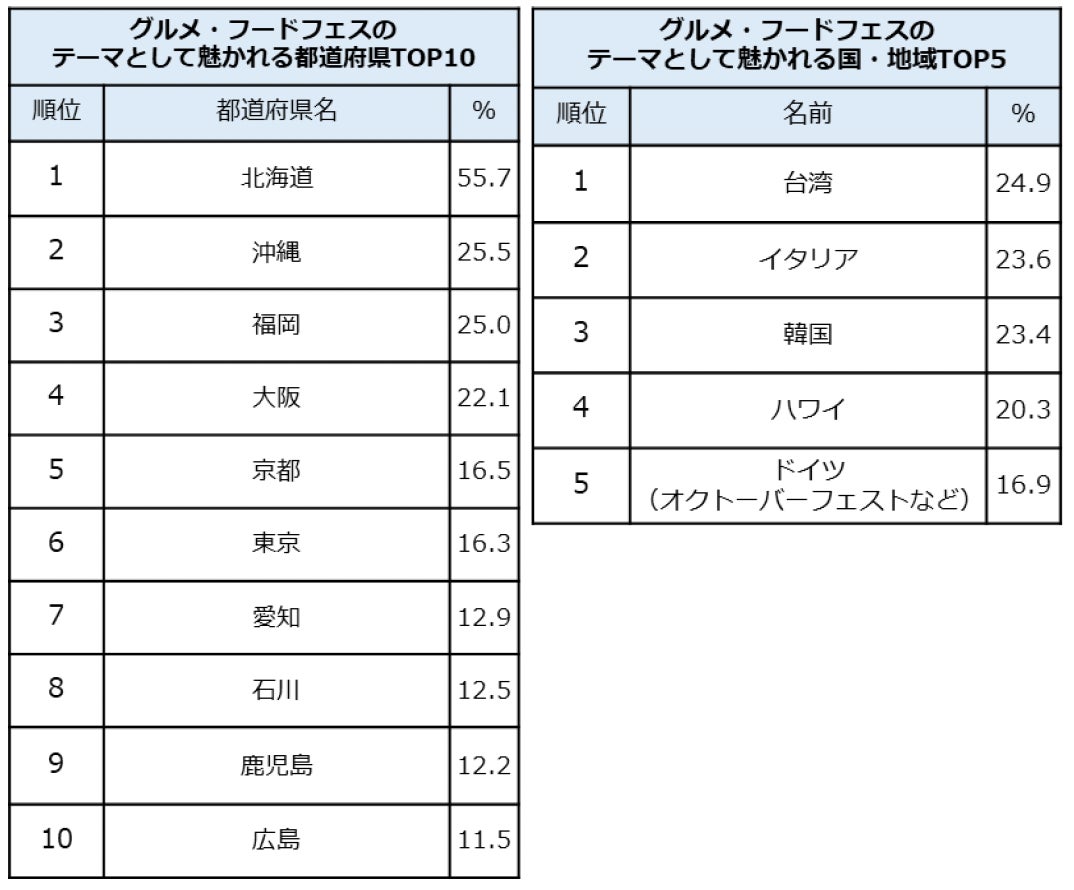 「都道府県がテーマのグルメ・フードフェスの場合、どの都道府県のものに行きたいと思いますか?」の質問で最も高かった回答は「北海道」で55.7%でした。2位「沖縄」(25.5%)のダブルスコアで断トツの人気です。3位にはご当地料理も多く、グルメ人気の高い「福岡」がランクイン。4位~7位は「大阪」(22.1%)、「京都」(16.5%)、「東京」(16.3%)、「愛知」(12.9%)と都市圏が入りました。同様に、海外をテーマにしたグルメ・フードフェス人気では、グルメ・スイーツが充実し、海外旅行先としても人気な「台湾」(24.9%)がトップに。日本でもよく見かけるオクトーバーフェストなどの「ドイツ」をテーマにしたフェスは5位で16.9%でした。