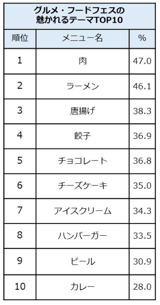 「どのようなテーマのグルメ・フードフェスに魅かれますか?」という質問で最も高かったのは「肉」で47.0%でした。さまざまな肉料理が一度に味わえる「肉フェス」人気の高さが窺えます。2位は「ラーメン」(46.1%)、3位「唐揚げ」(38.3%)、4位「餃子」(36.9%)、8位「ハンバーガー」(33.5%)、10位「カレー」(28.0%)がランクインしており、いろいろな店の味を食べ比べたいという人も多そうです。5位~7位には「チョコレート」(36.8%)、「チーズケーキ」(35.0%)、「アイスクリーム」(34.3%)とスイーツがランクインし、夏に人気の「ビール」をテーマにしたものは30.9%で9位でした。
