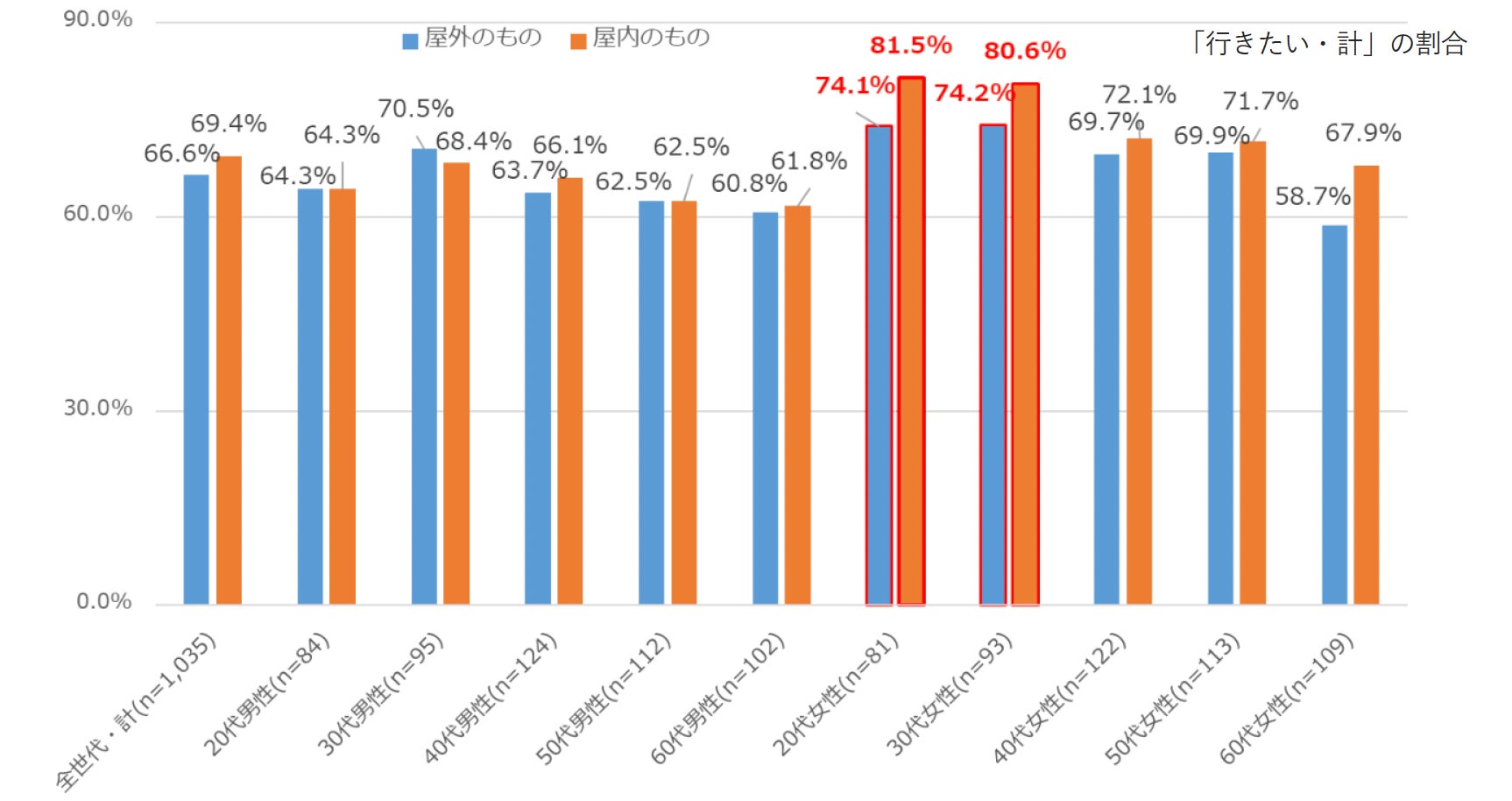 「グルメ・フードフェスに行きたいと思いますか?」という質問で「行きたい・計」は屋外のものについては66.6%、屋内のものについては69.4%でした。特に20代女性(屋外74.1%、屋内81.5%)、30代女性(屋外74.2%、屋内80.6%)からの人気が高いことが分かりました。