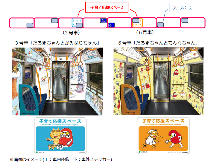大江戸線「子育て応援スペース」設置車両に新デザイン「だるまちゃん」シリーズが登場