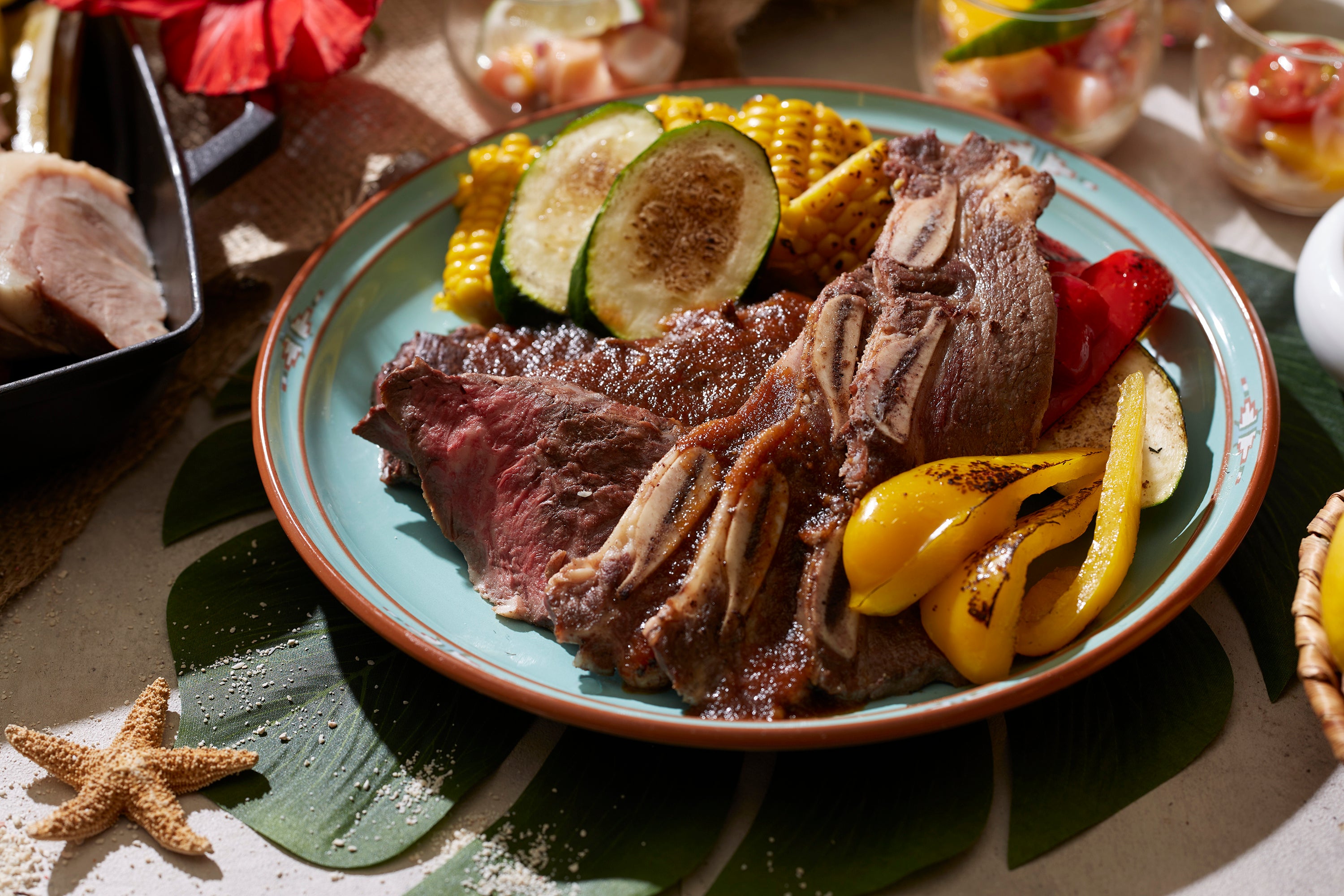 「ビーフステーキBBQソース」は、ジューシーに焼き上げた肉厚なアウトサイドビーフに、コク深いスパイシーな味わいのBBQソースをかけて仕上げました。またハワイで人気の白身魚マヒマヒのさっぱりとした口当たりとハラペーニョソースの辛味がくせになる「マヒマヒのスパイシーフライ」、ハワイのローカルフードである「アヒポケ」や「ロコモコ丼」、豚肩ロースをバナナの葉で包みじっくり焼いた「豚肩ロースのバナナリーフ焼き」など、本場の味を存分にお楽しみいただけます。
