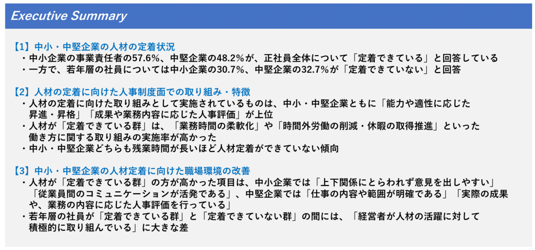 本リリースでは、「人材の定着」をテーマに、中小・中堅企業の事業責任者を対象とした調査結果を紹介しています。人材の定着ができている企業群に注目すると、業務時間の効率化やテレワークの導入といった働き方に関する制度を推進しているという特徴が見られました。加えて、特に中堅企業では、「成果や業務内容に応じた人事評価」に積極的に取り組んでいます。