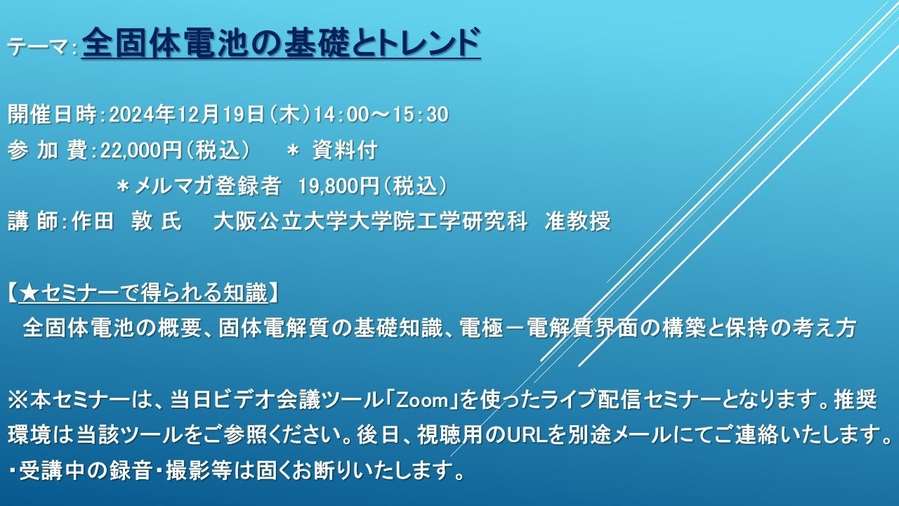 先端技術情報や市場情報を提供している(株)シーエムシー・リサーチ(千代田区神田錦町: https://cmcre.com/ )では、 各種材料・化学品などの市場動向・技術動向のセミナーや書籍発行を行っておりますが、 このたび「全固体電池の基礎とトレンド」と題するセミナーを、 講師に作田 敦 氏 (大阪公立大学大学院工学研究科 准教授)をお迎えし、2024年12月19日(木)14:00より、 ZOOMを利用したライブ配信で開催いたします。 受講料は、 一般:22,000円(税込)、 弊社メルマガ会員:19,800円(税込)となっております(資料付)。
