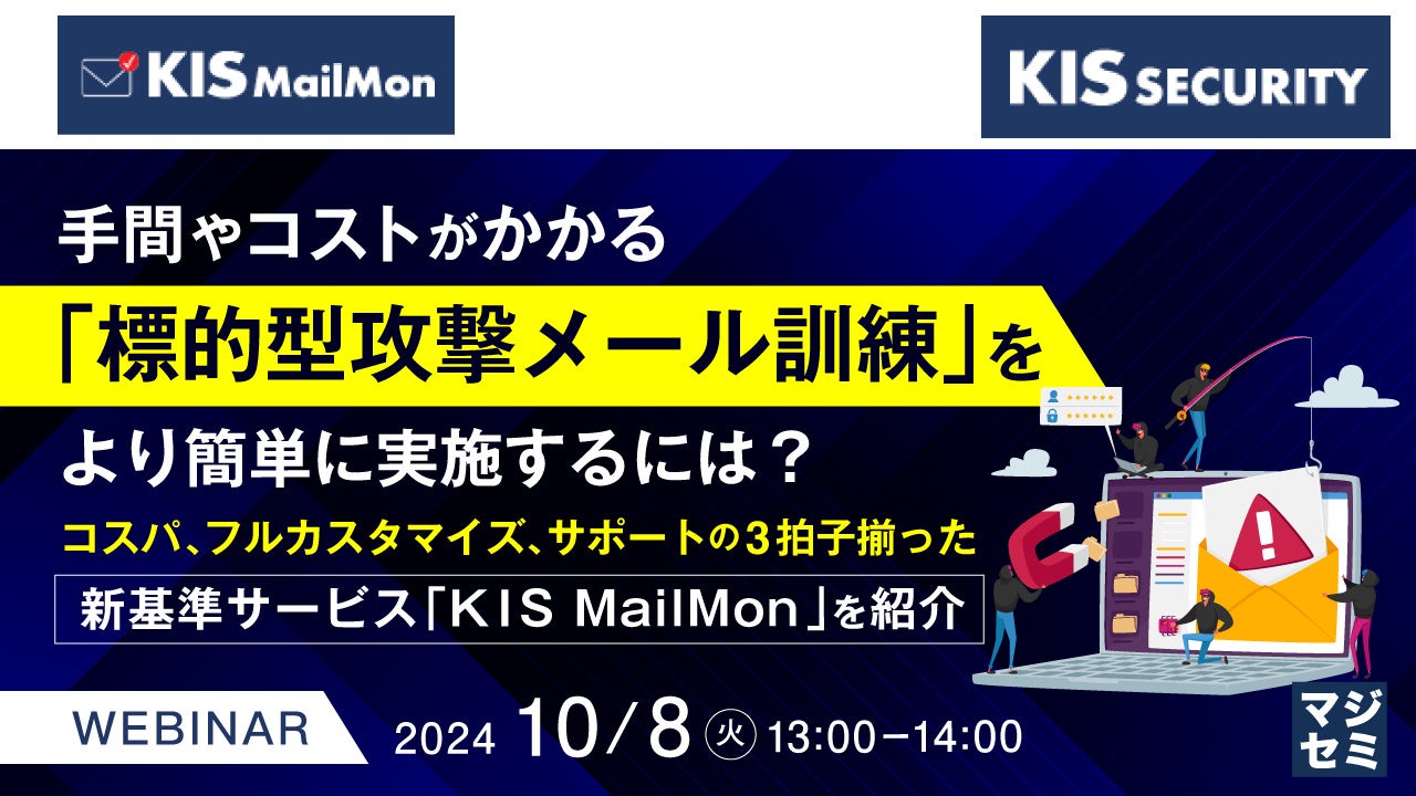 本セミナーでは、訓練実施者の負担軽減や従業員のセキュリティ意識改革に役立つ最適な方法として、標的型攻撃メール訓練サービス「KIS MailMon」をご紹介します。同サービスは「訓練実施者」視点で独自開発された簡単・便利な機能を搭載。また、カスタマイズ性に優れて充実したサポートを受けることが可能です。講演では、類似サービスとの比較などを踏まえ、コストを抑えつつ継続的にメール訓練を実施できるメリットなどを解説します。