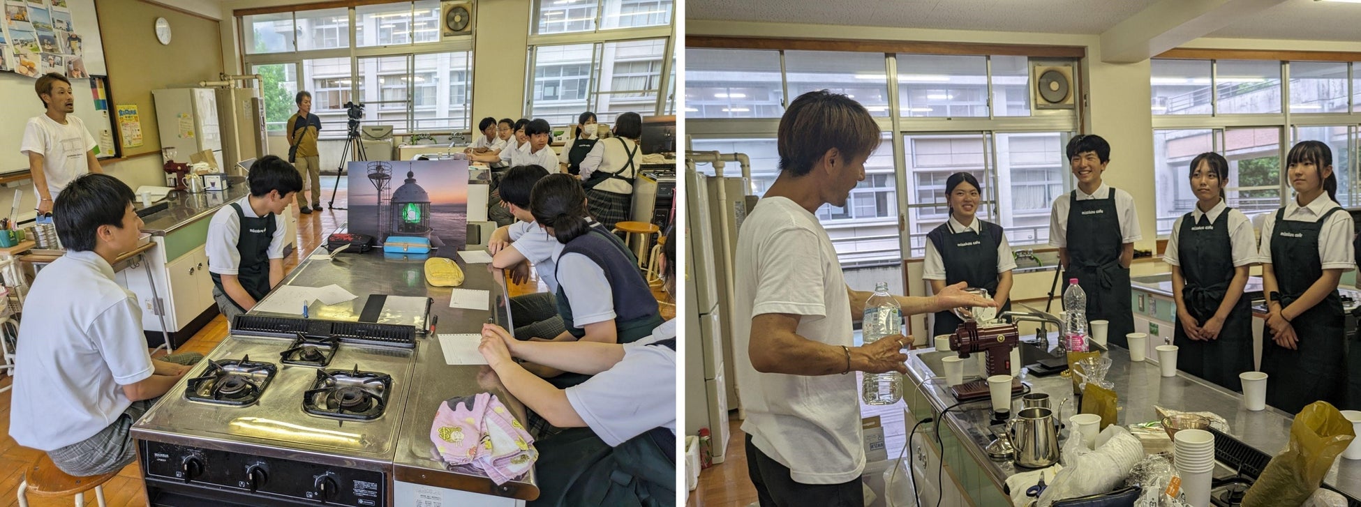 第二部では、まず高校生が考える「佐田岬灯台カフェ」のスタイルやコンセプトを思いつくままに発表していきます。生徒からは、「瀬戸内海と宇和海、2つの海を隔てる特別な場所」、「日没後数分だけ見られるエメラルドタイム」、「20分歩くので休憩場所が必要」、「灯台のバルコニーで提供したら特別なサービスになるのでは」、といった様々なアイデアが湧いてきました。その後は、実際に珈琲を提供するカフェ班と、カフェの屋号やロゴデザインを考える販促班に分かれて活動しました。カフェ班は一杯の珈琲を美味しく提供する際のポイントを戸田さんの実演を交えながら学び、販促班は「佐田岬灯台カフェ」らしさを屋号やロゴにどのように落とし込むか考えました。時間の制約があり、この日のワークショップは約2時間で終了となりましたが、大変内容の濃い初回の活動となりました。今後は、9~10月頃に高校生によるモニター営業を経て、11月に佐田岬灯台周辺で予定されているマルシェイベントへの出店を目指しています。