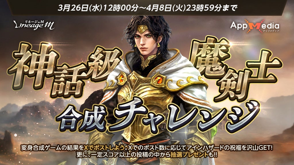 「神話魔剣士」もしくは「支配者ギルタス」の合成に成功するか、ゲームオーバーになったら、指定ハッシュタグ「#リネージュM」、「#新職業魔剣士実装」の2種をつけてXに結果をポストしていただいた方のポスト数に応じて条件達成ごとに、レベル70以上のキャラクターが存在するアカウントに「アインハザードの祝福」を郵便でプレゼントします。(最大「アインハザードの祝福」15,000プレゼント)