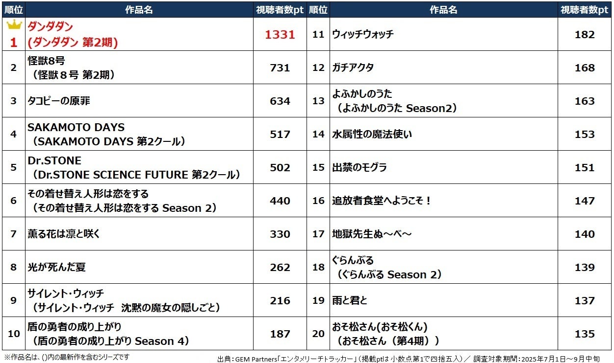 今シーズン、カラオケで最も歌われたのは、『ダンダダン』第2期のオープニングテーマ、アイナ・ジ・エンド「革命道中 - On The Way」。エンタテイメント業界に向けたデジタルマーケティングサービスを提供するGEM Partners株式会社が調査・集計した定額制動画配信サービスにおけるアニメ作品の視聴者数ランキングでも、本作が首位を獲得し、第1期に引き続き1位を独占しました。配信コンテンツ視聴者数ランキングとカラオケランキングの双方を照らし合わせることで、夏アニメのトレンドを紐解きます。