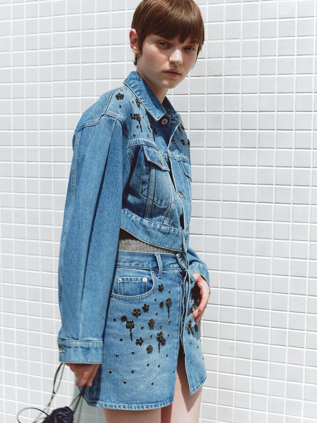 JACKET 18,920yen CARDIGAN 13,970yen BUSTIER 7,920yen SKIRT 12,980yen BOOTS 20,900yen BAG 15,950yen CAP 6,380yen PIERCED EARRING 6,380yen