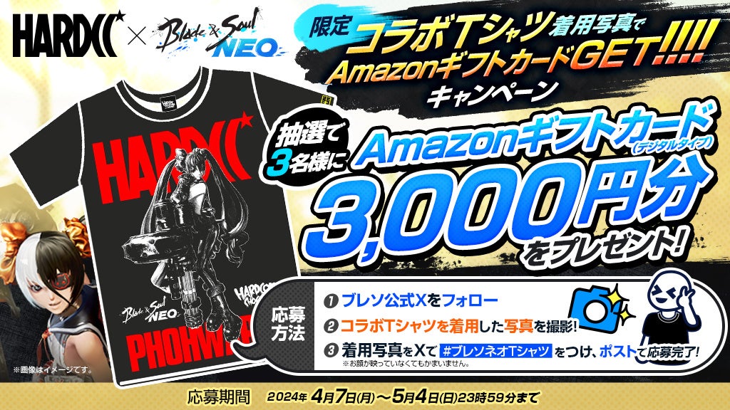 「ブレイドアンドソウル」公式X(旧Twitter)アカウント( https://x.com/bns_official_jp )をフォローして、『ハードコアチョコレート』×『ブレイドアンドソウルNEO』コラボTシャツを着ている写真を指定ハッシュタグ「 #ブレソネオTシャツ 」をつけてXでポストしていただいた方の中から抽選で3名様にAmazonギフトカード(デジタルタイプ)をプレゼントします。