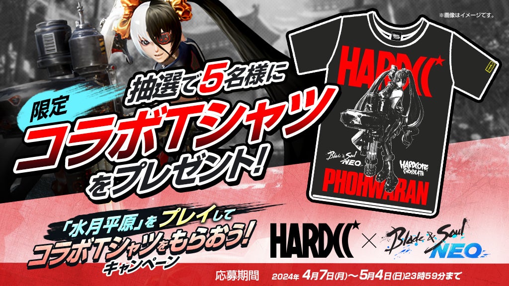 「ブレイドアンドソウル」公式X(旧Twitter)アカウント( https://x.com/bns_official_jp )をフォローして3月26日(水)に「ブレイドアンドソウルNEO」に登場した新エリア「水月平原」の感想を指定ハッシュタグ「 #水月平原やってみた 」をつけてXでポストしていただいた方の中から抽選で5名様に『ハードコアチョコレート』×『ブレイドアンドソウルNEO』コラボTシャツをプレゼントします。