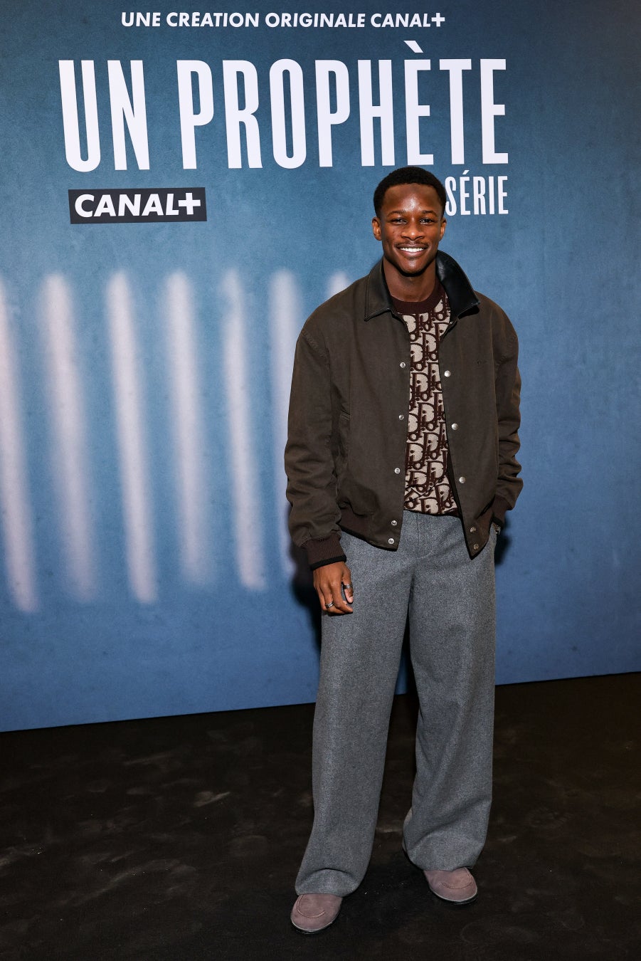 ママドゥ・シディベは、レザーカラーをあしらったブラウンのコットンボンバージャケットと、ベージュの「ディオール オブリーク」ウールスウェットシャツ、グレーのウールパンツ、そしてピンクのレザーローファーを着用しました。