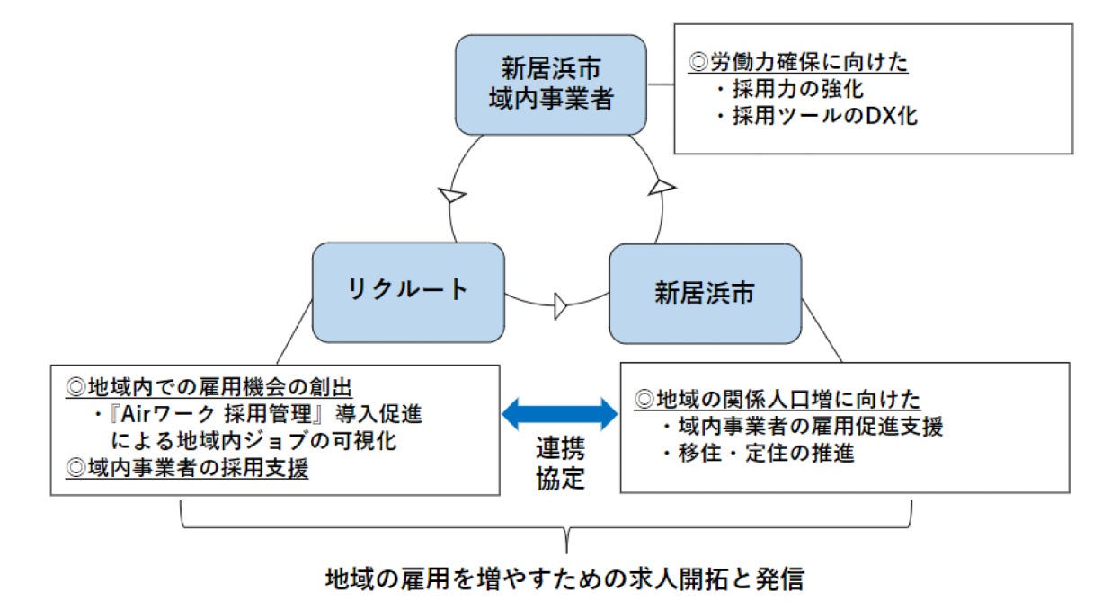 株式会社リクルート(本社:東京都千代田区、代表取締役社長:北村 吉弘、以下当社)は、2024年9月27日、愛媛県新居浜市との間で雇用促進と地域活性化に向けた人口定着に関する協定を締結し、連携を開始することとなりましたので、お知らせ致します。『Airワーク 採用管理』で、地元企業の採用ホームページ開設を支援します。