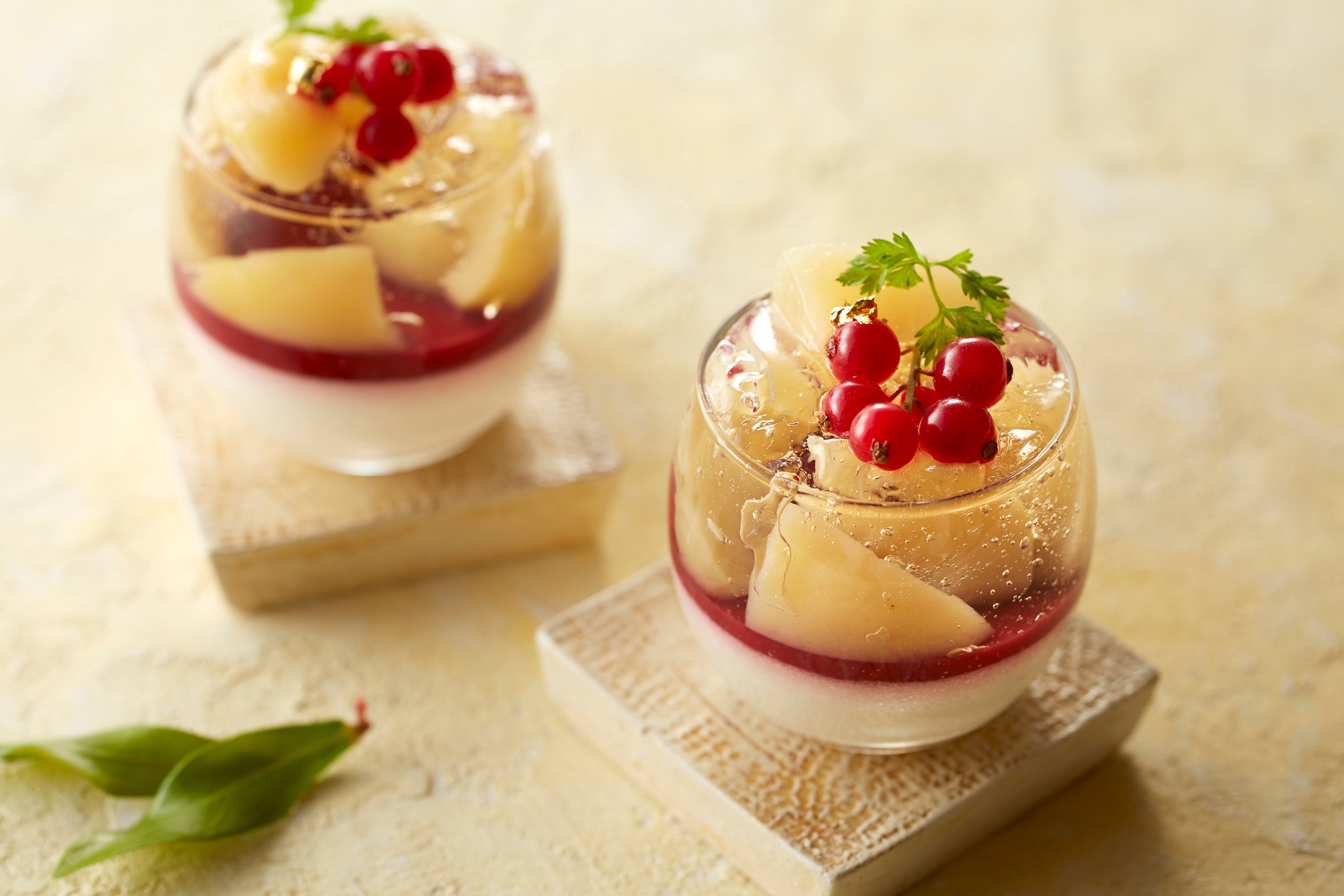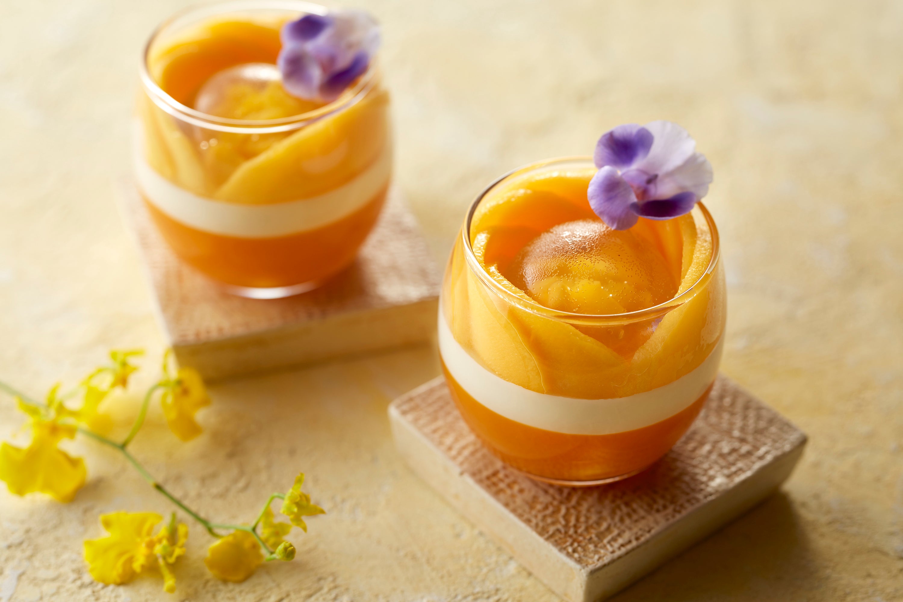 マンゴーのゼリーにココナツのパンナコッタを重ね、トップにはマンゴー水晶ゼリーをあしらいました。グラデーションの層と水晶ゼリーが見た目にも涼しげな一品です。