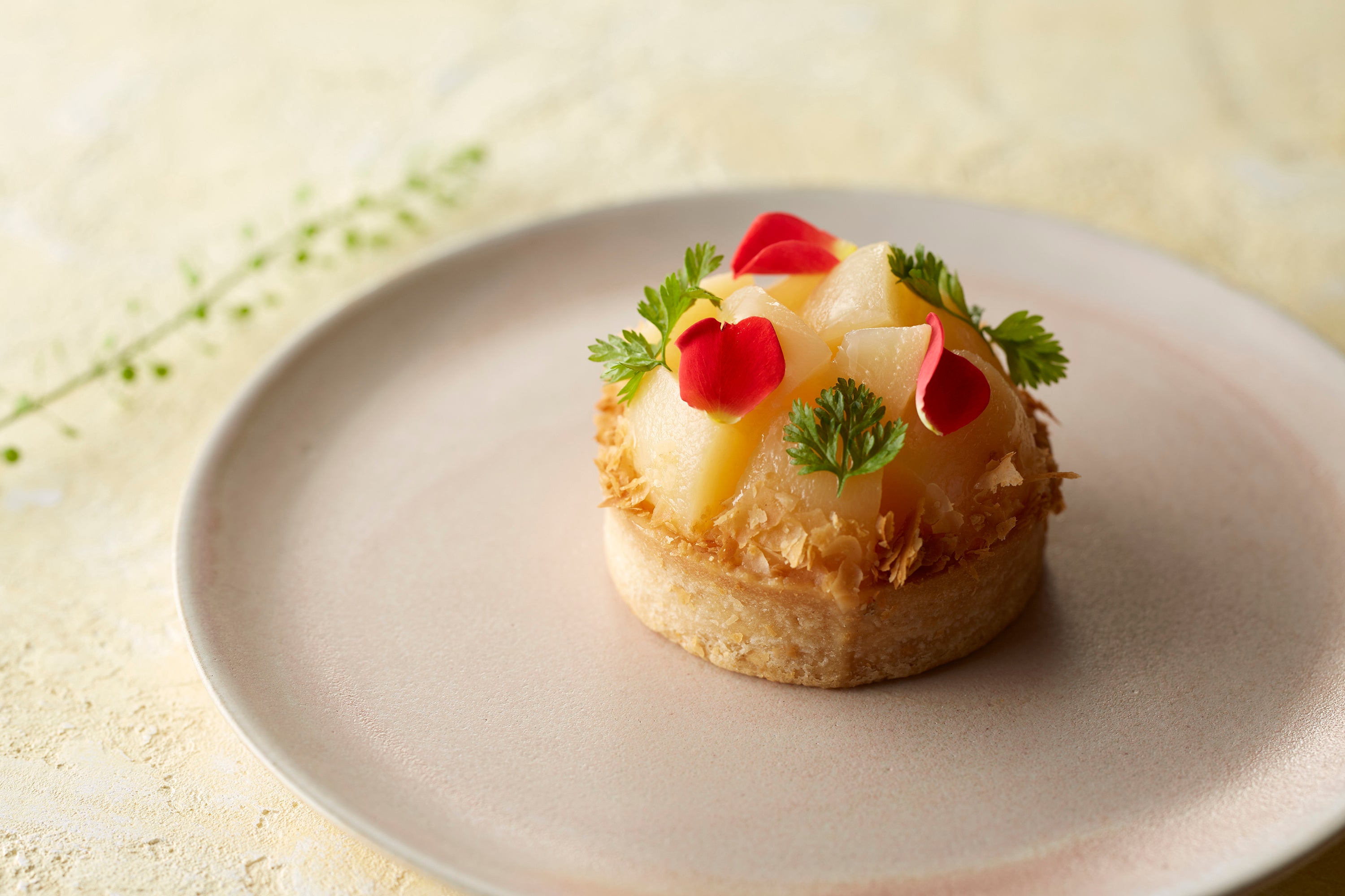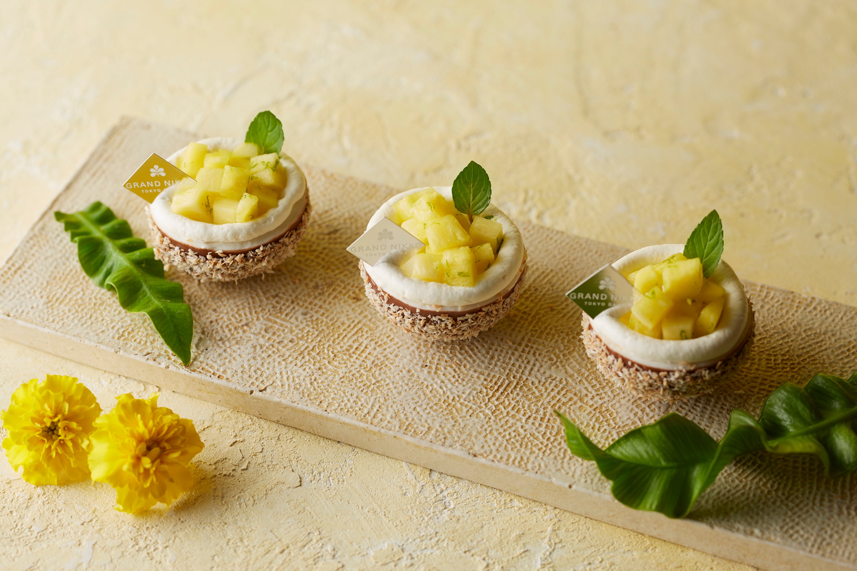 ココナツムースとパッションフルーツのクリームに、パイナップルのジュレとコンポートを飾りました。パイナップルにはライムの香りをつけており、爽やかな風味を感じさせます。