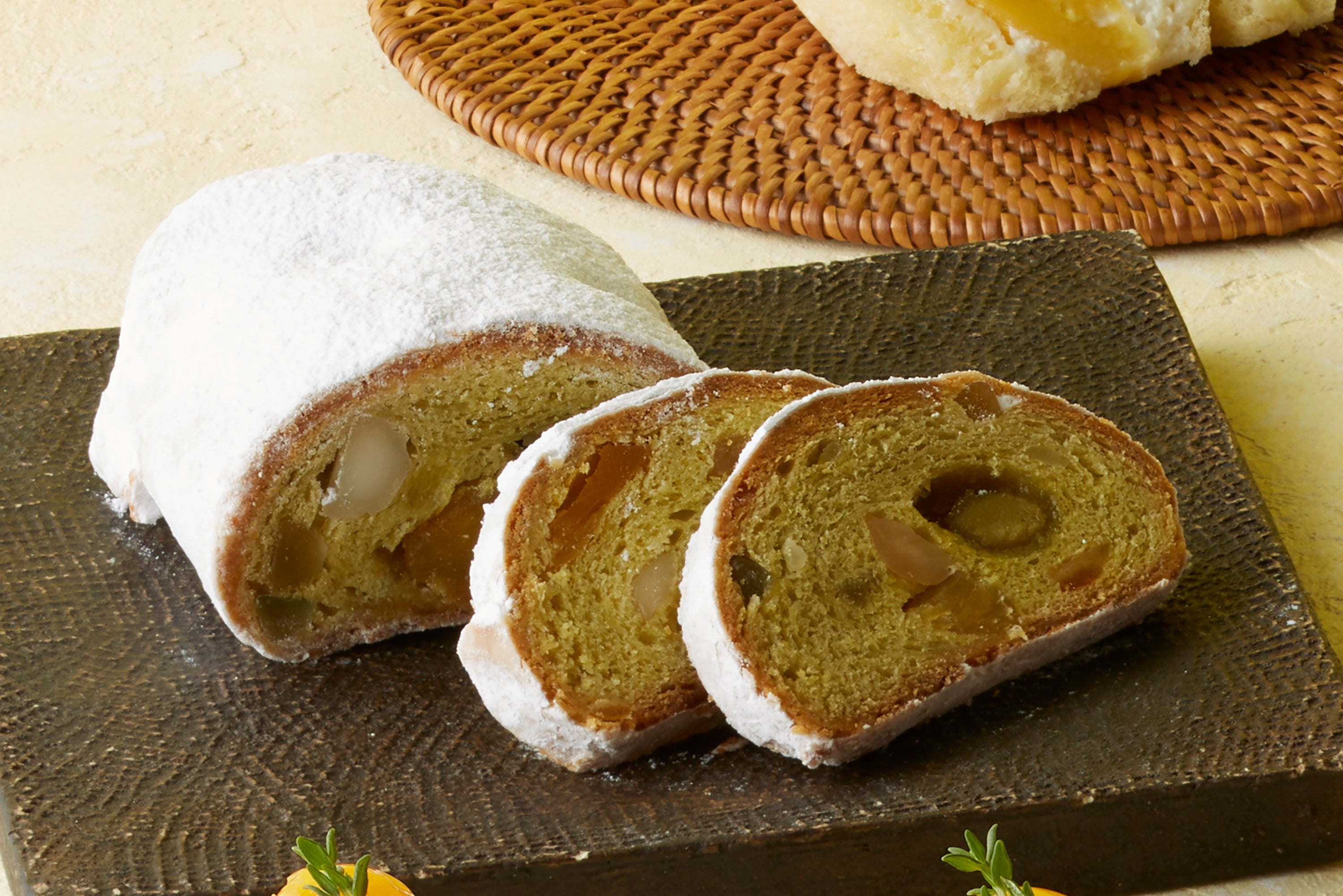 クリスマスの定番菓子であるシュトーレンを夏仕様に仕立てました。ピスタチオペーストやマカダミアナッツ、マンゴーやパイナップルなどのトロピカルフルーツで作ったドライフルーツを練り込んでいます。スパイス類が入っていないため、軽い口当たりで召し上がっていただけます。