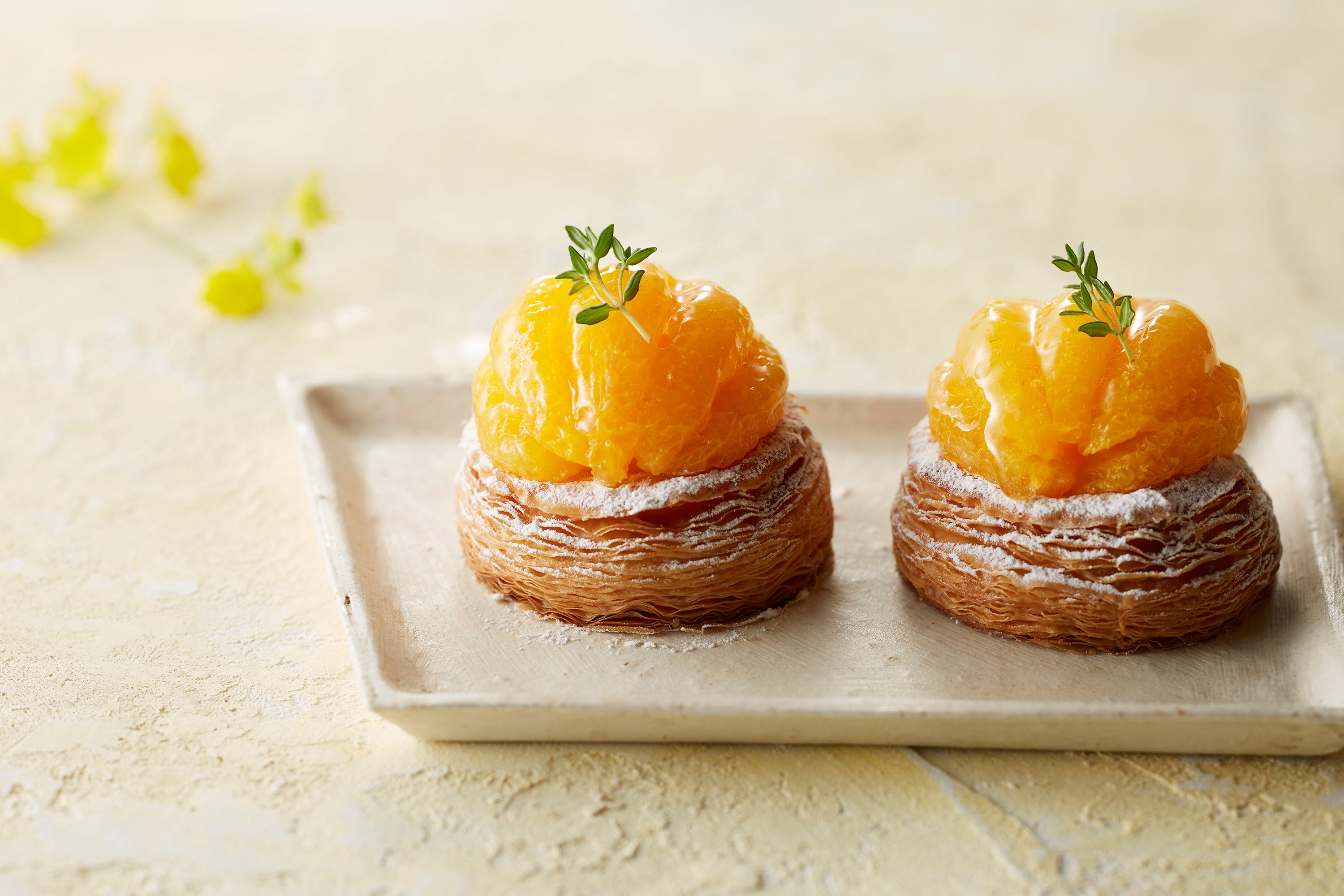サクサクのデニッシュ生地にカスタードクリームを絞り、オレンジをふんだんにあしらいました。鮮やかなビタミンカラーが夏らしい一品です。