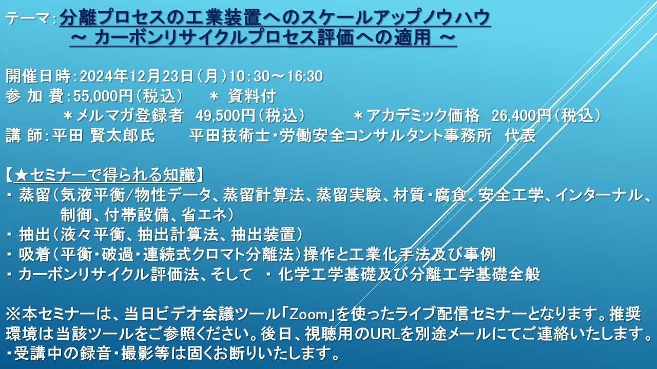 先端技術情報や市場情報を提供している(株)シーエムシー・リサーチ(千代田区神田錦町: https://cmcre.com/ )では、 各種材料・化学品などの市場動向・技術動向のセミナーや書籍発行を行っておりますが、 このたび「分離プロセスの工業装置へのスケールアップノウハウ ~ カーボンリサイクルプロセス評価への適用 ~」と題するセミナーを、 講師に平田 賢太郎氏 (平田技術士・労働安全コンサルタント事務所 代表)をお迎えし、2024年12月23日(月)10:30より、 ZOOMを利用したライブ配信で開催いたします。 受講料は、 一般:55,000円(税込)、 弊社メルマガ会員:49,500円(税込)、 アカデミック価格は26,400円(税込)となっております(資料付)。