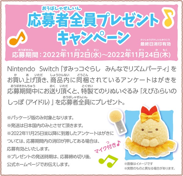 ゲームに登場するアイドルコスチュームの「えびふらいのしっぽ」の、とってもかわいいてのりぬいぐるみがもらえるチャンスです!ぜひ、応募期間内(2022年11月2日水曜日~2022年11月24日木曜日:最終日消印有効)にお買い求めいただき、奮ってご応募してください︕