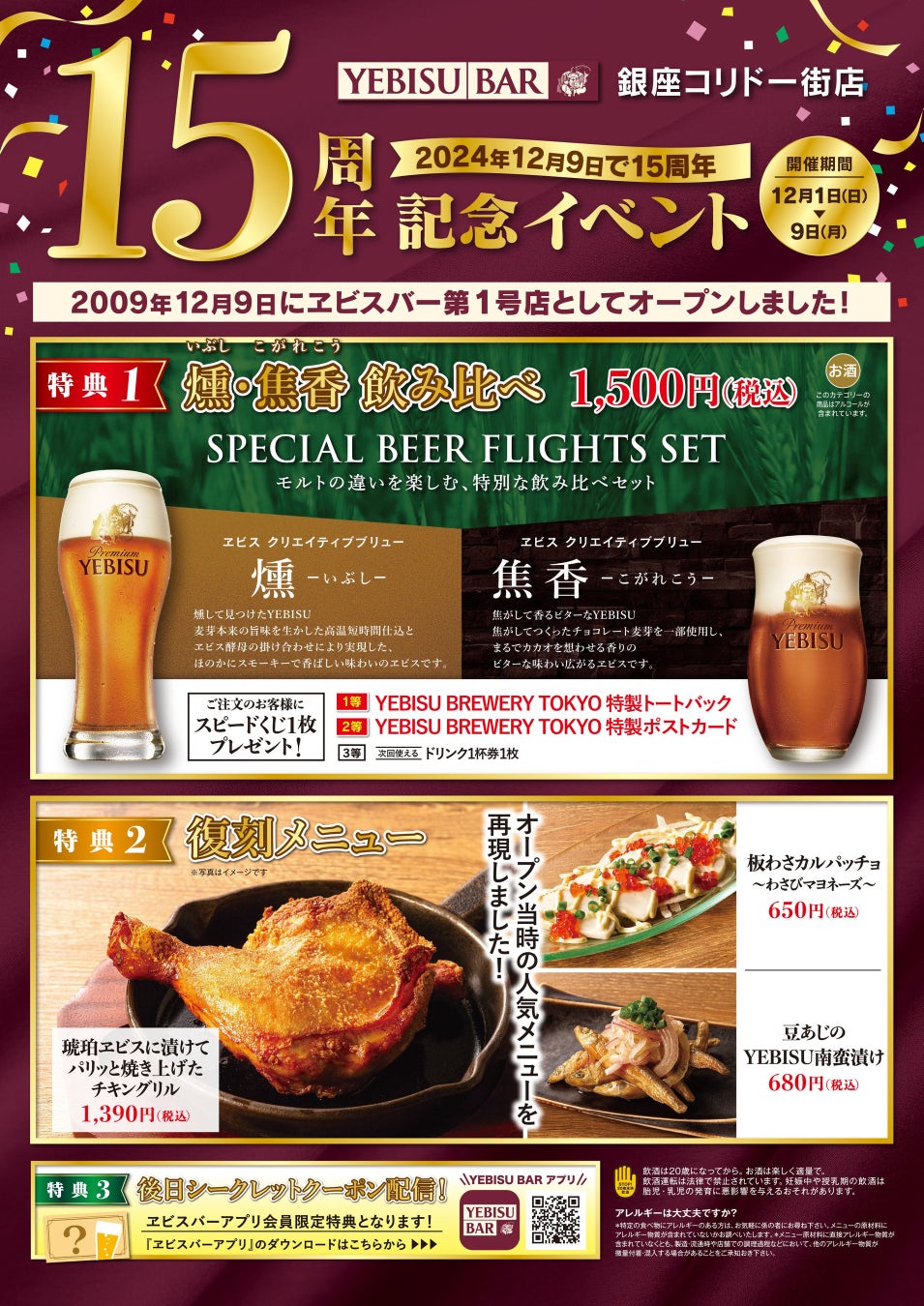 おかげさまで15周年「YEBISU BAR 銀座コリドー街店」12月1日~9日の9日間限定 記念イベントを開催!
