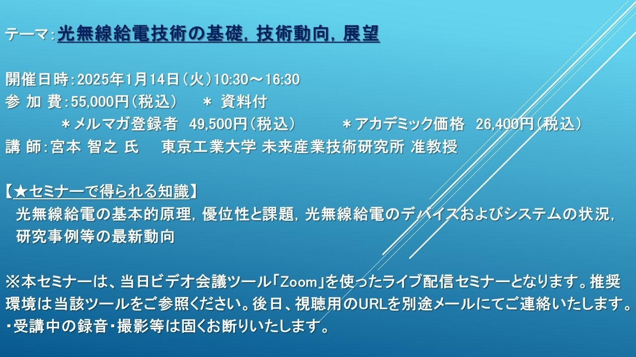 先端技術情報や市場情報を提供している(株)シーエムシー・リサーチ(千代田区神田錦町: https://cmcre.com/ )では、 各種材料・化学品などの市場動向・技術動向のセミナーや書籍発行を行っておりますが、 このたび「光無線給電技術の基礎,技術動向,展望」と題するセミナーを、 講師に宮本 智之 氏 (東京工業大学 未来産業技術研究所 准教授)をお迎えし、2025年1月14日(火)10:30より、 ZOOMを利用したライブ配信で開催いたします。 受講料は、 一般:55,000円(税込)、 弊社メルマガ会員:49,500円(税込)、 アカデミック価格は26,400円(税込)となっております(資料付)。