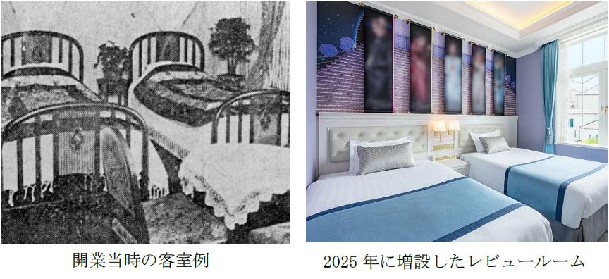 旧ホテル開業当時の客室数は59室。リゾートホテルのような佇まいと、ヨーロッパ調の客室インテリアは当時の人々の話題となりました。新ホテルの客室数は200室。宝塚歌劇公演で使用された舞台小道具などを展示した「レビュールーム」が好評となり、2025年に写真パネルや衣装を展示した4つのテーマの「レビュールーム」を新たに増設しました。