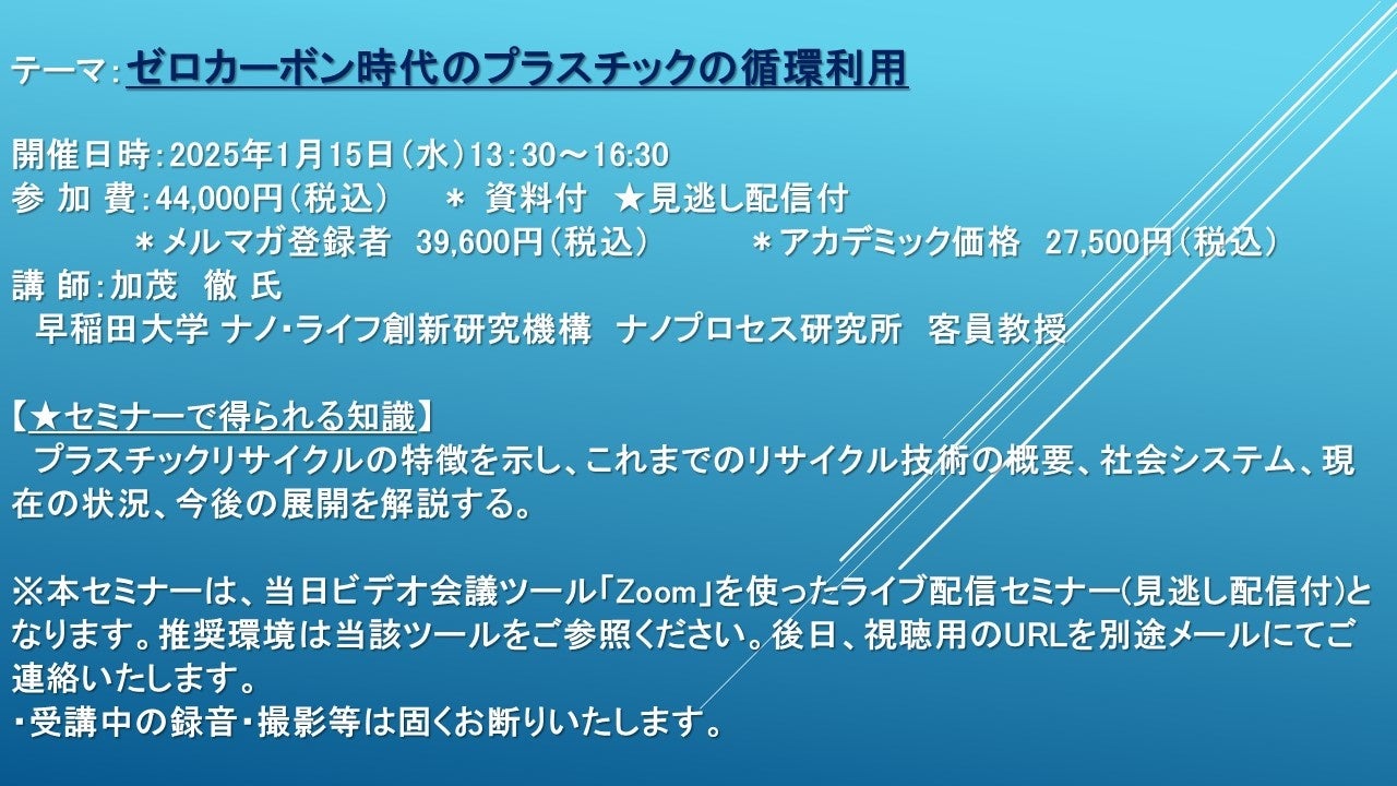 先端技術情報や市場情報を提供している(株)シーエムシー・リサーチ(千代田区神田錦町: https://cmcre.com/ )では、 各種材料・化学品などの市場動向・技術動向のセミナーや書籍発行を行っておりますが、 このたび「ゼロカーボン時代のプラスチックの循環利用」と題するセミナーを、 講師に加茂 徹 氏 (早稲田大学 ナノ・ライフ創新研究機構 ナノプロセス研究所 客員教授)をお迎えし、2025年1月15日(水)13:30より、 ZOOMを利用したライブ配信(見逃し配信付き)で開催いたします。 受講料は、 一般:44,000円(税込)、 弊社メルマガ会員:39,600円(税込)、 アカデミック価格は27,500円(税込)となっております(資料付)。