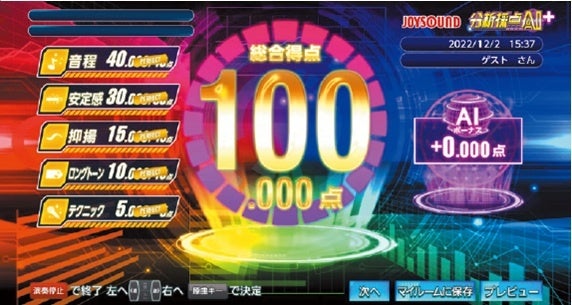 このほか、カラオケの盛り上げに欠かせない採点機能には、より人に近い感覚で歌声を判定できる「分析採点AI+」を搭載。約600万件に及ぶ膨大なデータの中から、上手に聞こえる歌に共通したポイントを解析、人が感じた点数に近い採点が可能なAIによる「分析採点AI」に、プロボイストレーナーによる採点実績をインプットすることで、より自然な歌唱で高得点が出るように進化しました。