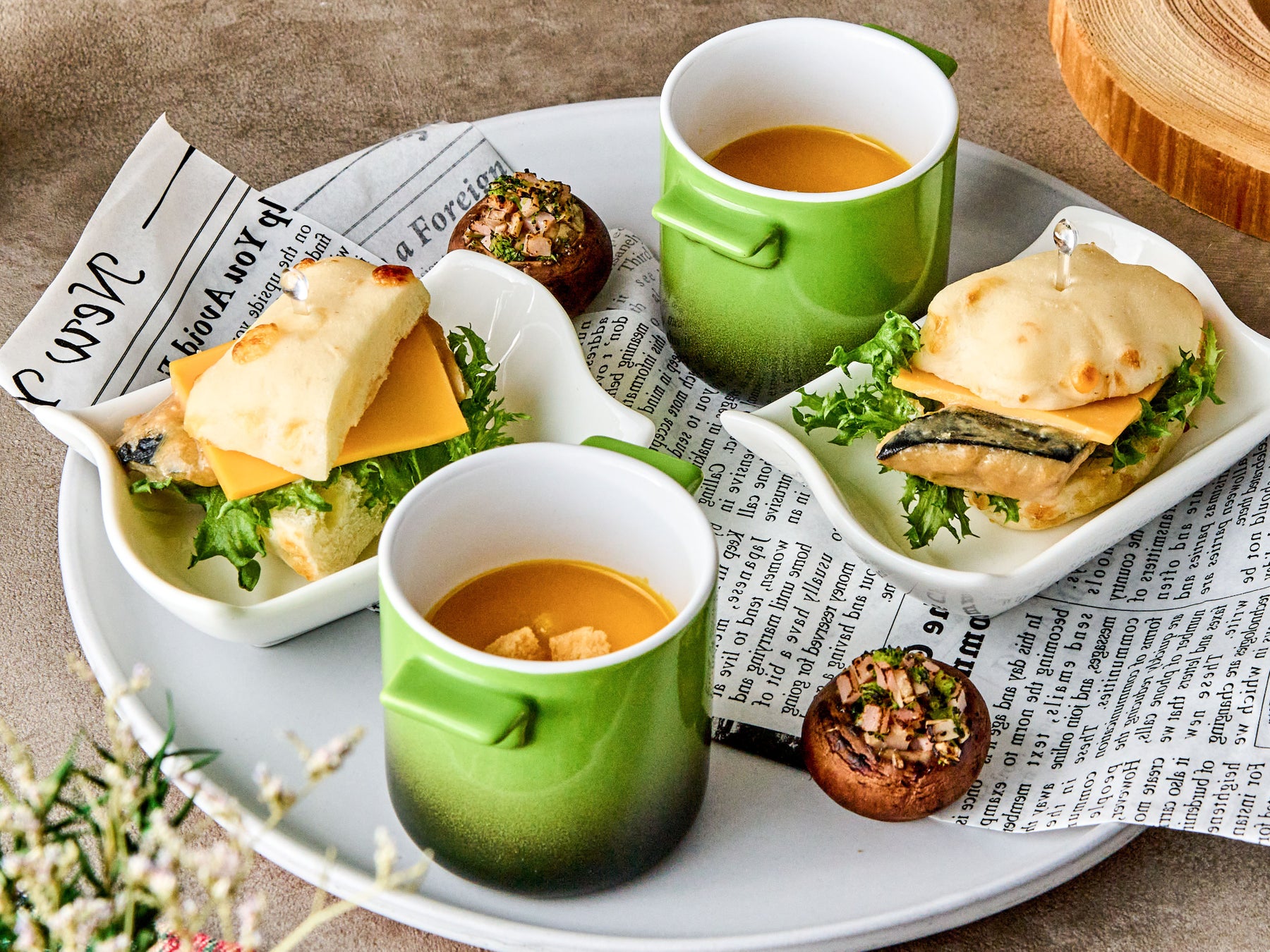 季節ごとにテーマを変えて提供しているアフタヌーンティー。今回は、秋の味覚をふんだんに使用したメニューをご用意いたしました。上段には、しゅわっとした食感のメレンゲモンブラン、かぼちゃのタルト、洋なしのムースをラインナップ。中段は、シナモンの香りが広がる一口サイズのアップルパイ、中のごろっとしたさつまいもと黒ゴマがアクセントのスコーンを。セイボリーには、サバとチーズが絶妙にマッチするサバみそサンドや、ブラウンマッシュルームのファルシをご用意しました。お酒とも相性抜群ですので、一緒にお召し上がりいただくのもおすすめです(別途注文が必要です)。