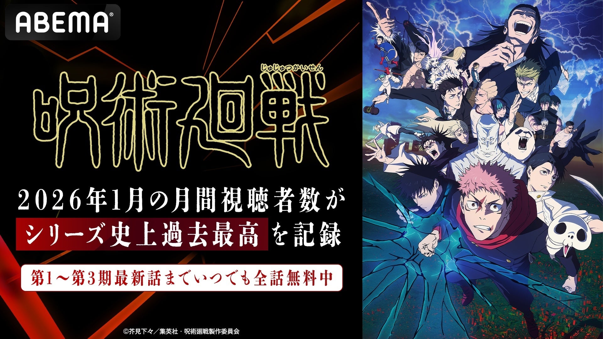 新しい未来のテレビ「ABEMA」は、大人気TVアニメ『呪術廻戦』第3期「死滅回游 前編」について、「ABEMA」における2026年1月の月間視聴者数が、シリーズ史上過去最高を記録したことをお知らせいたします。